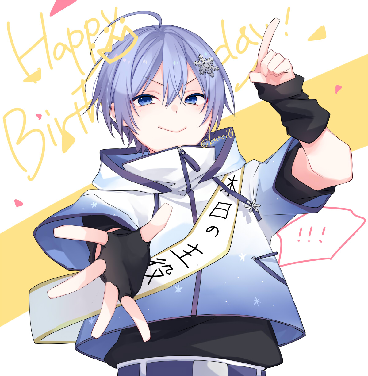 ! >:) 1boy ahoge black_gloves black_shirt blue_eyes blue_hair closed_mouth fingerless_gloves gloves hair_between_eyes hair_ornament happy_birthday highres jacket kuroi_(liar-player) male_focus neo-porte sash shirayuki_reid shirt short_sleeves smile snowflake_hair_ornament solo spoken_exclamation_mark translation_request twitter_username two-tone_background upper_body v-shaped_eyebrows virtual_youtuber white_background white_jacket yellow_background