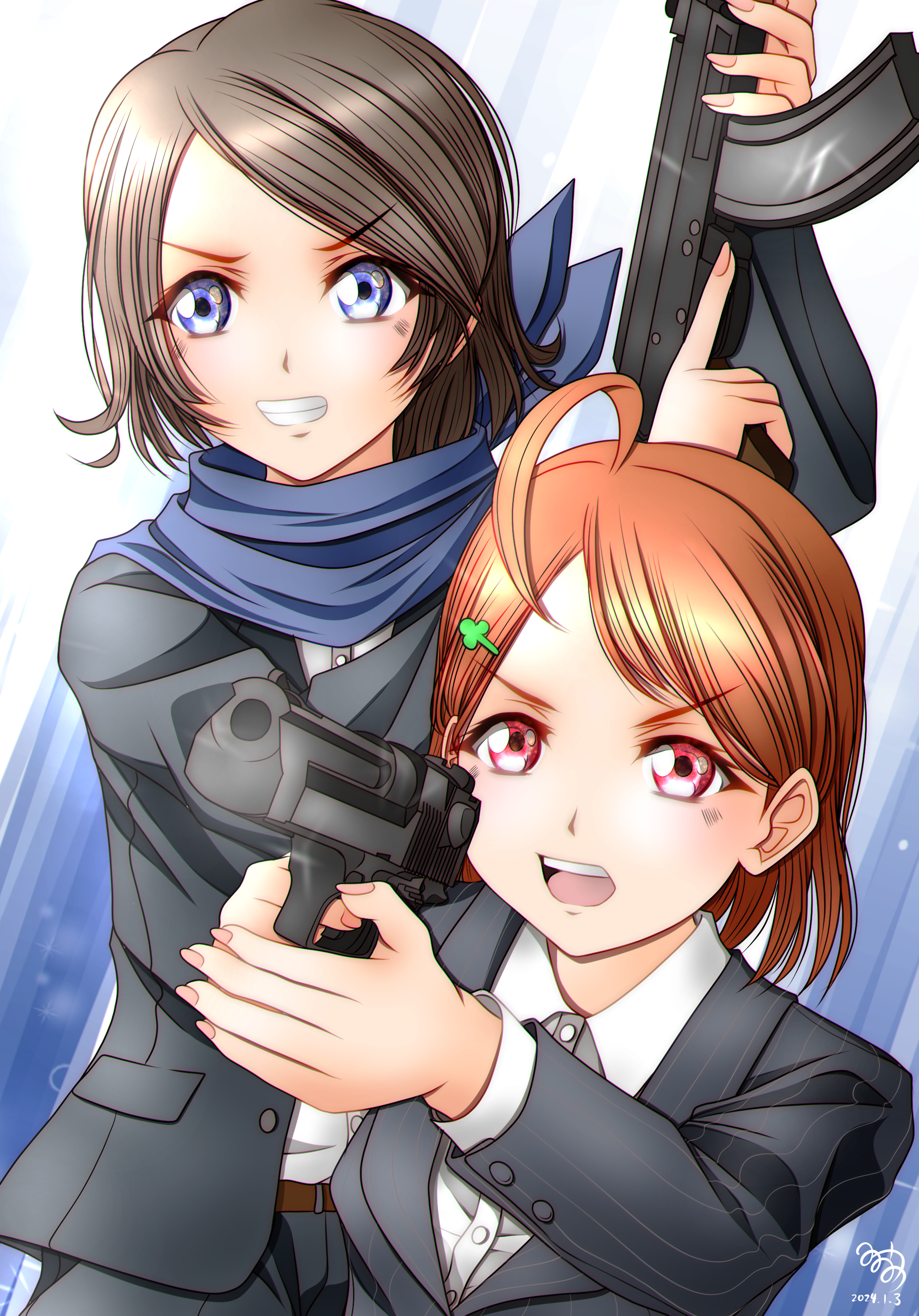 2girls absurdres blue_eyes brown_hair formal_clothes gun highres long_hair love_live! love_live!_sunshine!! medium_hair minami_saan multiple_girls red_eyes suit takami_chika watanabe_you weapon