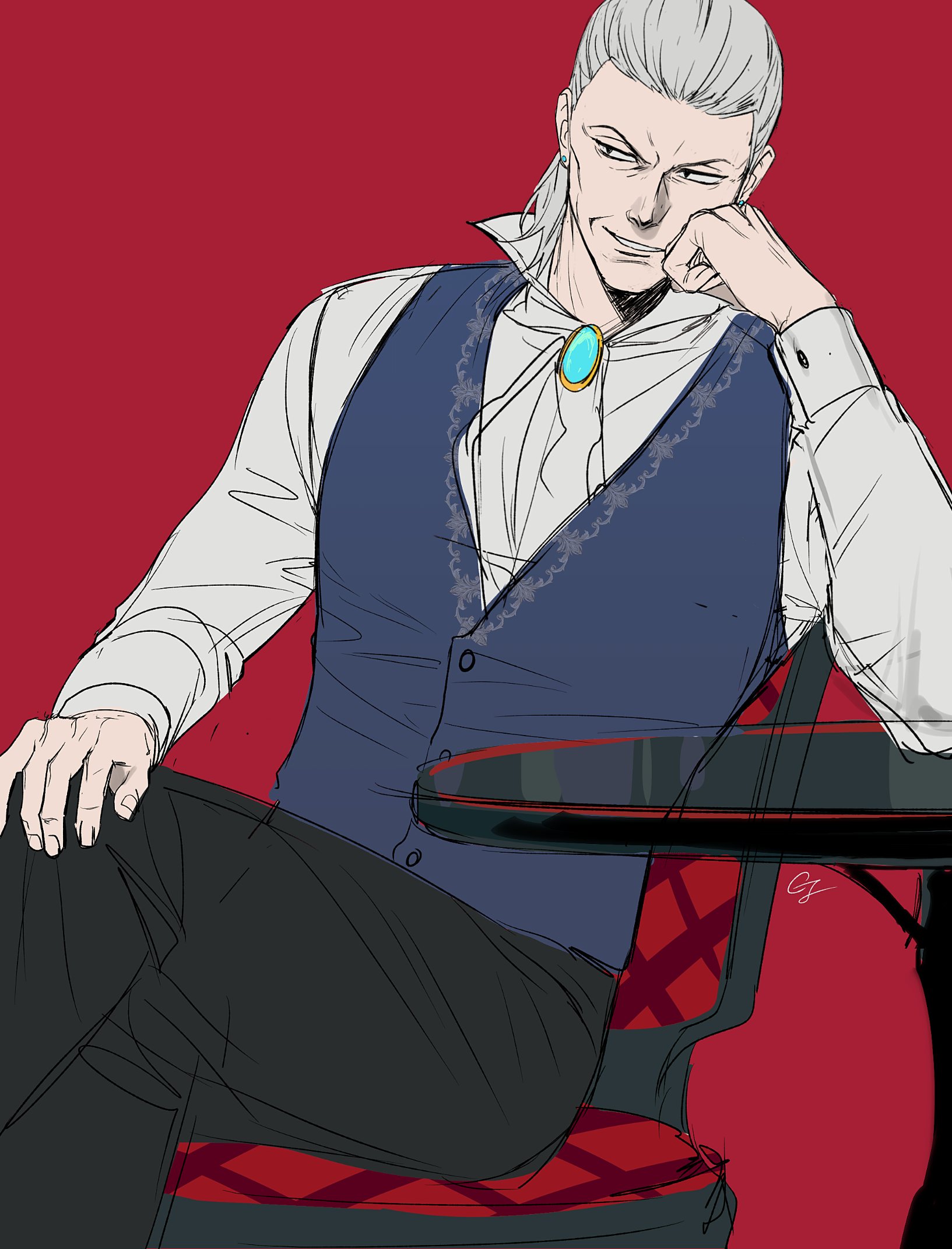 1boy ace_attorney ascot black_pants blue_vest brooch buttons chair cheekbones collared_shirt evil_grin evil_smile fingernails grin gwiga0 hand_on_own_knee highres jewelry looking_to_the_side male_focus manfred_von_karma old old_man pants red_background shirt short_hair signature simple_background smile solo table vest white_ascot white_hair white_shirt
