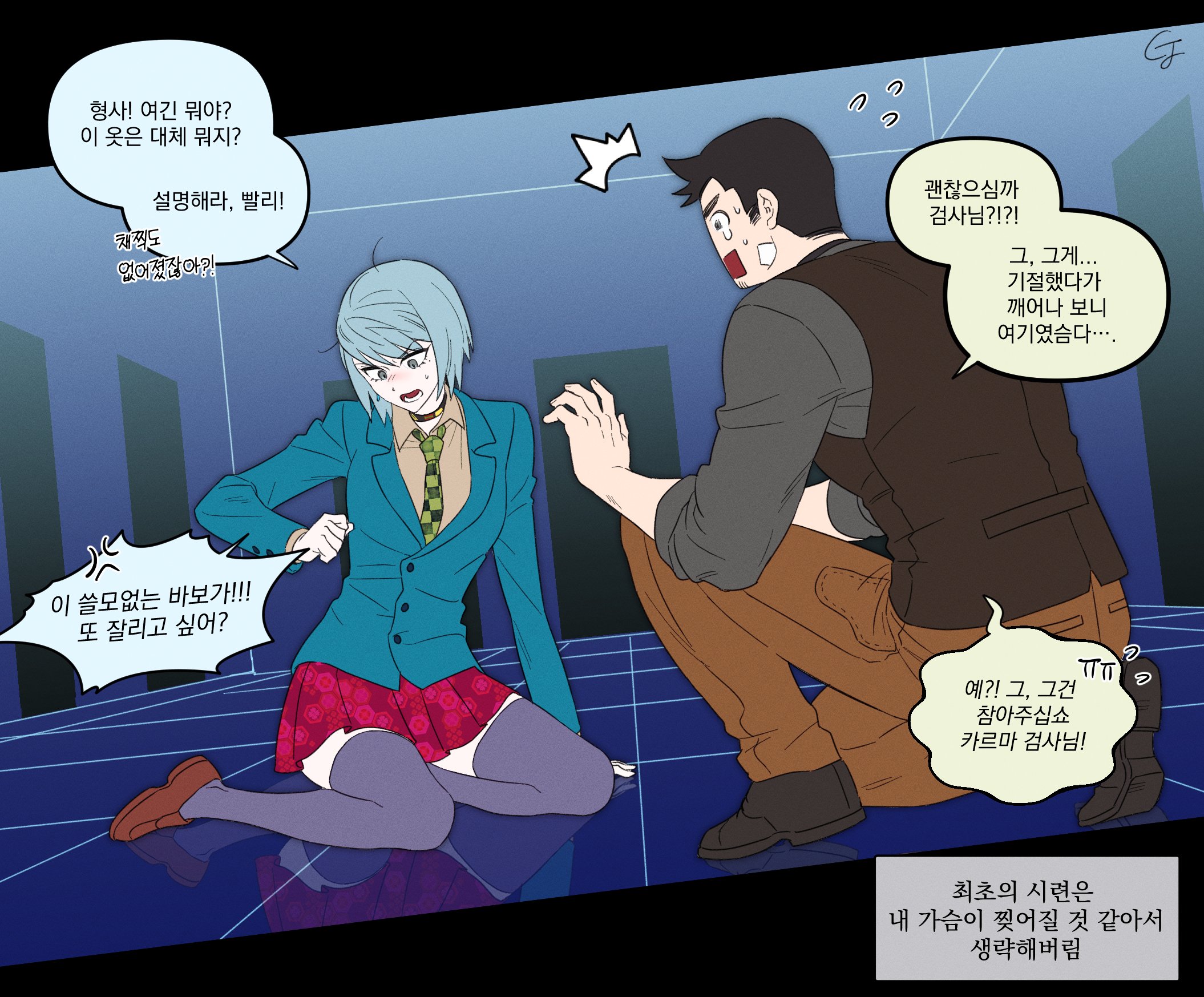 1boy 1girl ace_attorney black_footwear black_hair blue_hair blue_jacket brown_footwear brown_pants brown_vest checkered_necktie chidouin_sara chidouin_sara_(cosplay) choker cosplay dick_gumshoe facial_hair franziska_von_karma goatee_stubble green_necktie grey_eyes grey_shirt grey_thighhighs gwiga0 highres jacket kimi_ga_shine kneeling korean_text looking_down necktie pants red_skirt shinogi_keiji shinogi_keiji_(cosplay) shirt short_hair sideburns_stubble skirt speech_bubble stubble thighhighs translation_request vest zettai_ryouiki