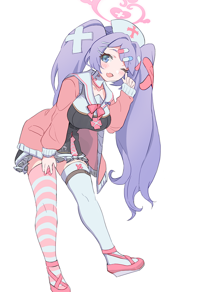 0.7_(aysatnegr) 1girl asymmetrical_legwear black_dress blue_archive blue_eyes blush breasts collarbone dress frilled_dress frills full_body halo hanae_(blue_archive) hat jacket large_breasts long_hair long_sleeves looking_at_viewer mismatched_legwear nurse_cap one_eye_closed open_clothes open_jacket open_mouth pink_halo pink_jacket pink_shoes purple_hair shoes simple_background smile solo striped_clothes striped_thighhighs thighhighs white_background white_hat white_thighhighs