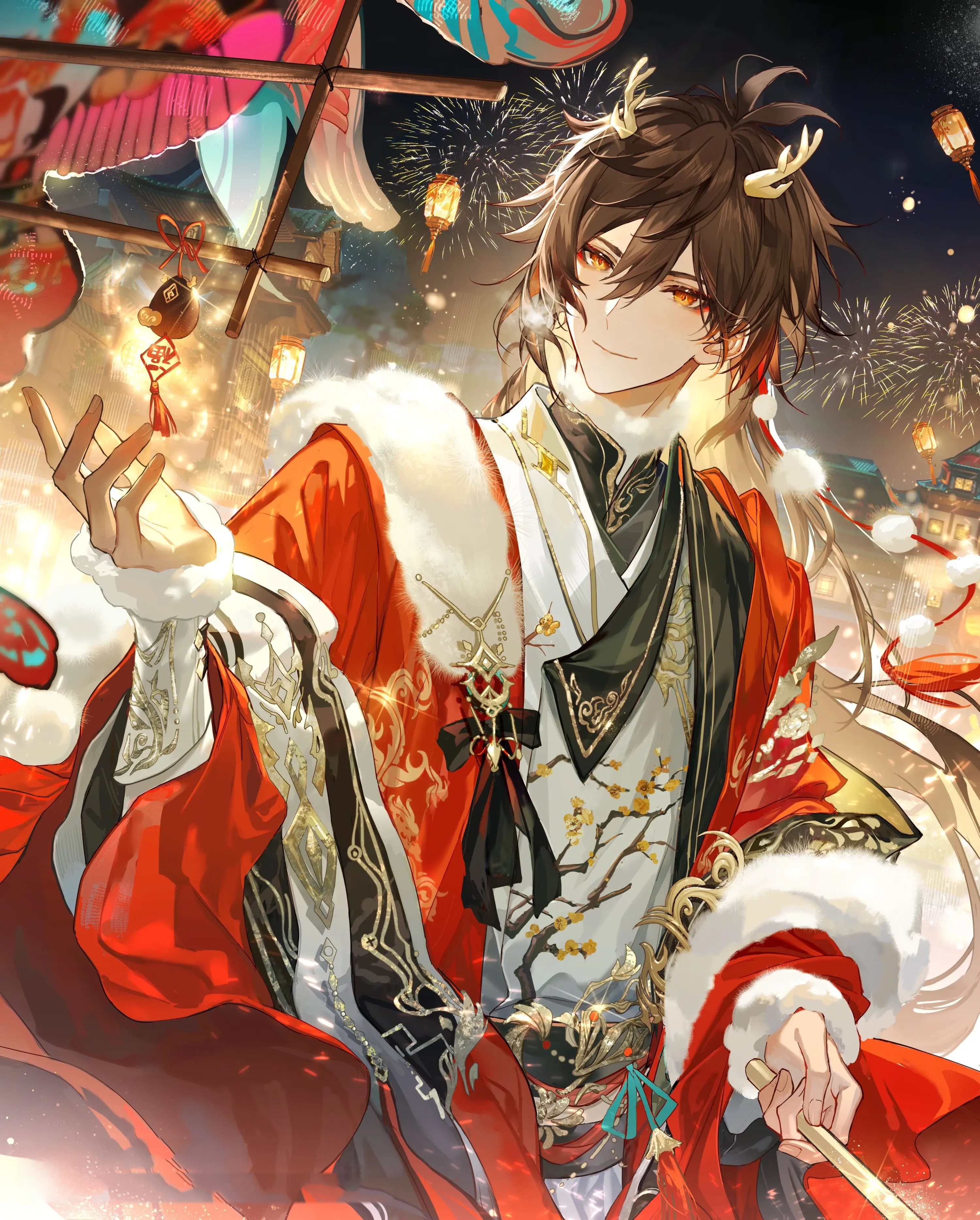 1boy absurdres alternate_costume alternate_hairstyle chinese_clothes chinese_collar dragon_horns firework_background fireworks fur_trim genshin_impact hanfu highres holding holding_lantern horns lantern long_hair long_sleeves male_focus night qing sky smile solo tassel zhongli_(genshin_impact)