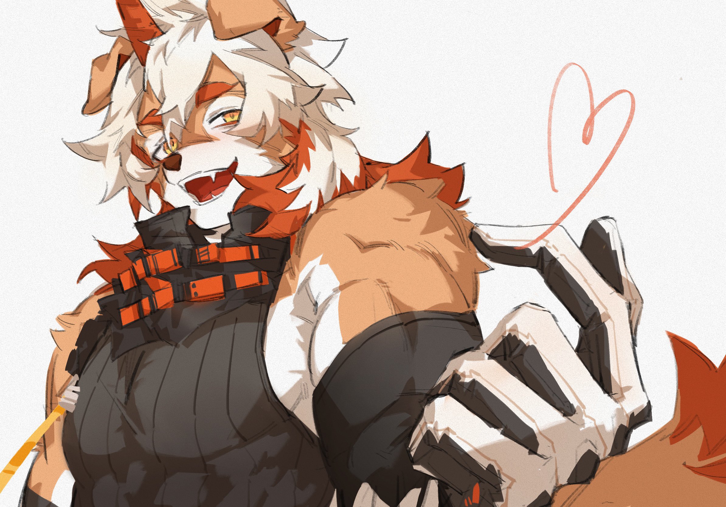 1boy arknights bara biceps black_shirt chinese_commentary colored_tips commentary_request fangs furry furry_male haru41113 heart highres horns hung_(arknights) komainu_boy komainu_ears komainu_tail looking_at_viewer male_focus multicolored_hair muscular muscular_male open_mouth shirt single_horn sleeveless sleeveless_shirt smile upper_body white_background