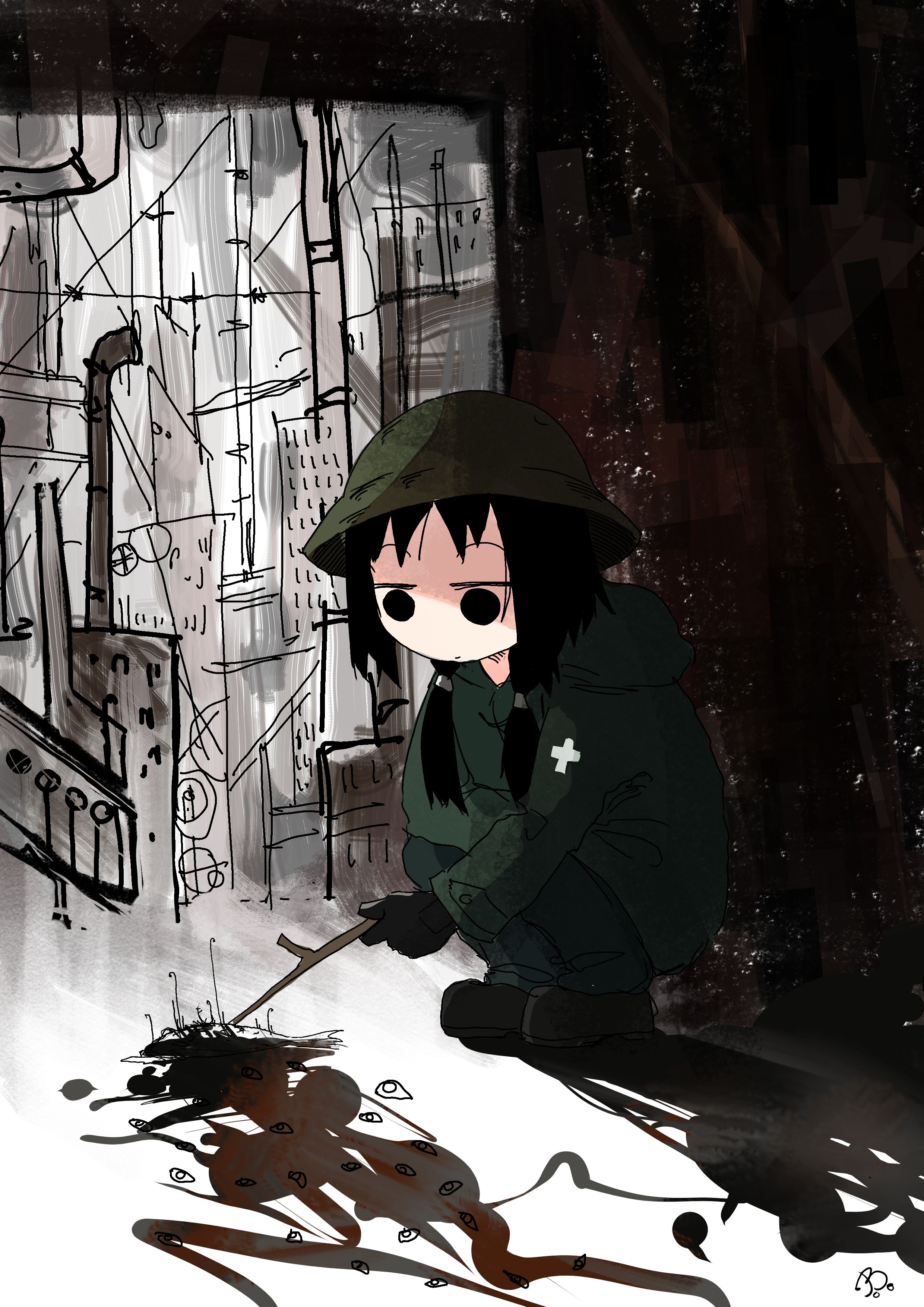 1girl abstract_background absurdres artist_logo black_eyes black_hair brodie_helmet chito_(shoujo_shuumatsu_ryokou) combat_helmet full_body gloves helmet highres holding holding_stick jean_bomjan logo long_hair low_twintails military military_uniform poking shadow shoujo_shuumatsu_ryokou sketch sketch_background solid_circle_eyes solo squatting stick twintails