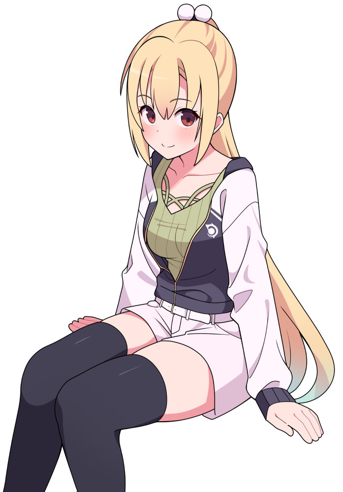1girl arihara_nanami arms_at_sides black_thighhighs blonde_hair blush breasts casual closed_mouth collarbone commentary eyes_visible_through_hair feet_out_of_frame green_shirt hair_between_eyes hair_ornament jacket knees_together_feet_apart letterman_jacket long_hair long_sleeves medium_breasts official_alternate_costume official_alternate_hairstyle open_clothes open_jacket partially_unzipped pom_pom_(clothes) pom_pom_hair_ornament ponytail red_eyes riddle_joker shirt shorts simple_background sitting skindentation sleeves_past_wrists smile solo split_mouth straight_hair untranslatable_commentary thighhighs thighs very_long_hair white_background white_shorts zettai_ryouiki zlmh7okwwbmghfo