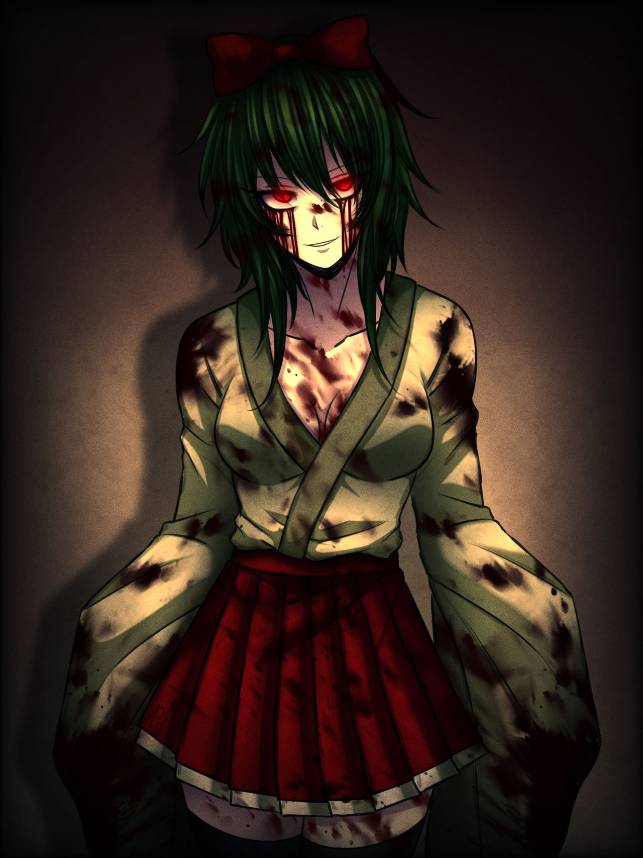 blood blood_on_clothes blood_on_face bloody_tears bow green_hair gumi highres japanese_clothes kimono mai_shishikusa masa_works_design onibi onibi_series red_bow red_eyes thighhighs vocaloid