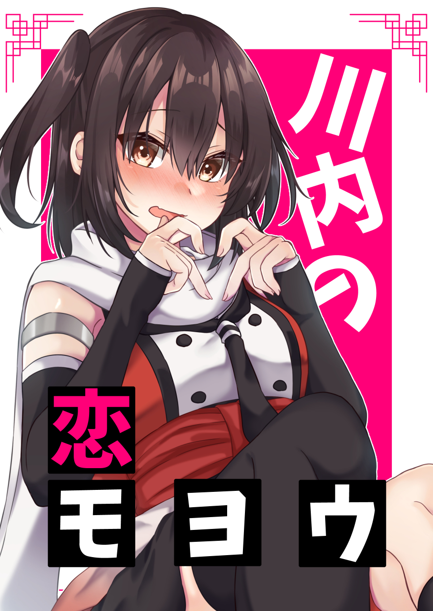 1girl asymmetrical_legwear black_gloves black_hair black_neckerchief black_skirt black_thighhighs brown_eyes comiket_103 commentary_request cowboy_shot elbow_gloves fingerless_gloves gloves highres izumo_ayuka kantai_collection neckerchief scarf school_uniform sendai_(kancolle) sendai_kai_ni_(kancolle) serafuku single_thighhigh sitting skirt solo thighhighs translation_request two_side_up white_scarf