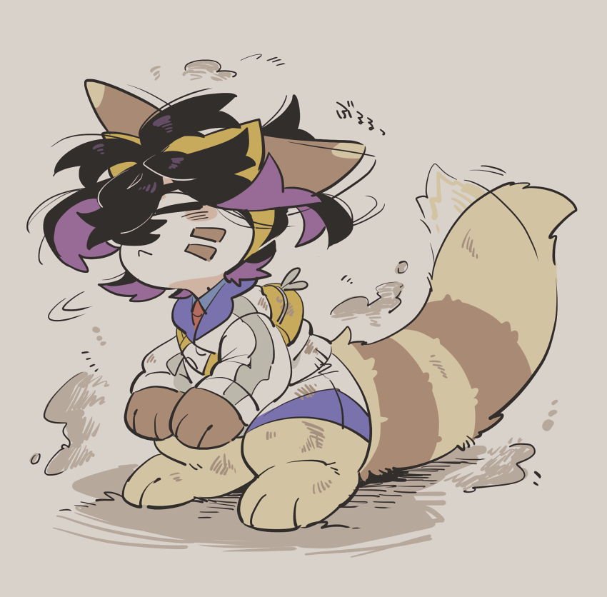1boy :< ahoge animal animal_ears animal_hands bag belt belt_buckle black_hair blue_shirt body_fur brown_background brown_fur buckle closed_mouth commentary_request crossed_bangs dirt dirty facial_mark fewer_digits full_body furret gen_2_pokemon hair_between_eyes hairband jacket kemonomimi_mode kieran_(pokemon) lunchbox_(artist) male_focus mole mole_on_neck multicolored_hair necktie nintendo on_ground outdoors paw_print pawpads pokemon pokemon_(creature) pokemon_scarlet_and_violet purple_hair red_necktie shaking shirt short_hair shorts simple_background strap tail trembling two-tone_hair whisker_markings white_jacket white_shorts yellow_belt yellow_eyes yellow_hairband