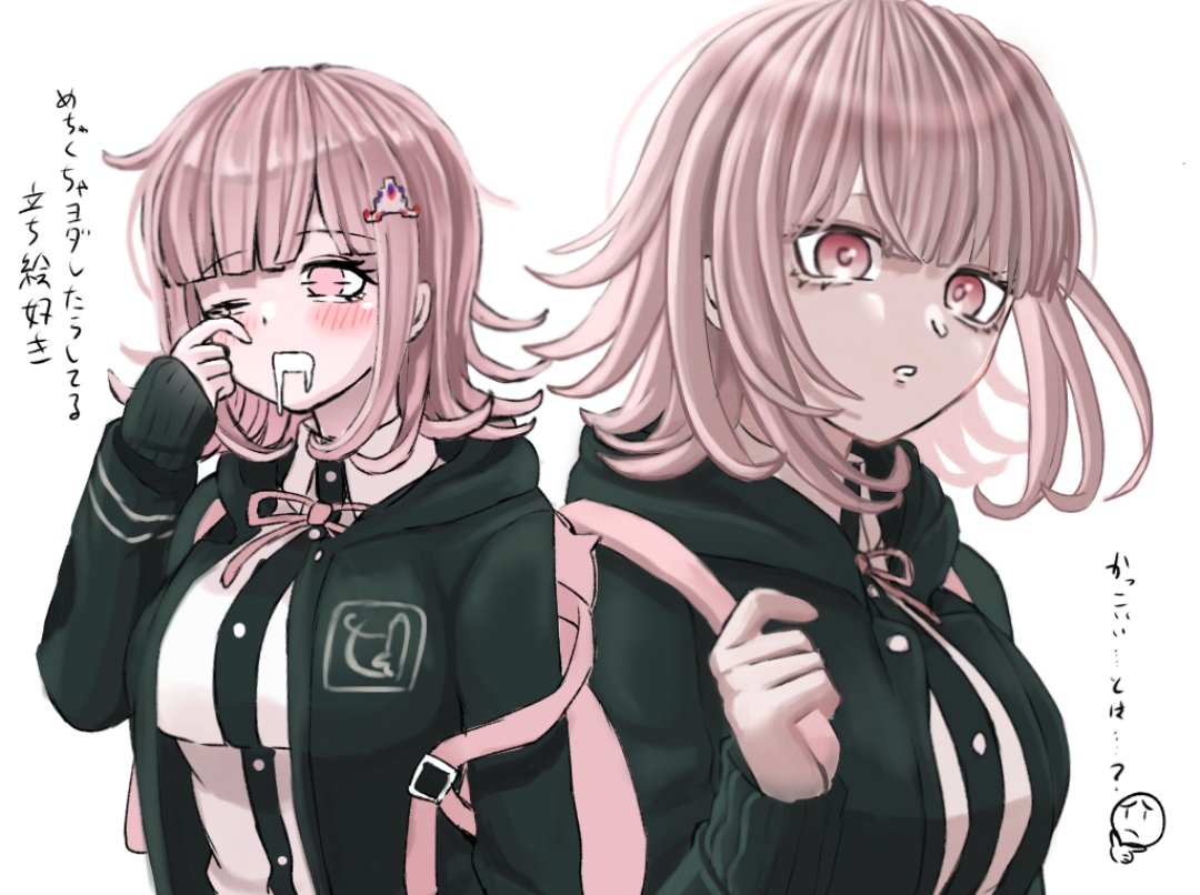 1girl backpack bag black_jacket blush breasts danganronpa_(series) danganronpa_2:_goodbye_despair drooling hood hood_down jacket large_breasts medium_hair mozuku_(iiiiiiimomo) nanami_chiaki neck_ribbon one_eye_closed open_clothes open_jacket pink_bag pink_eyes pink_ribbon ribbon simple_background translation_request upper_body white_background