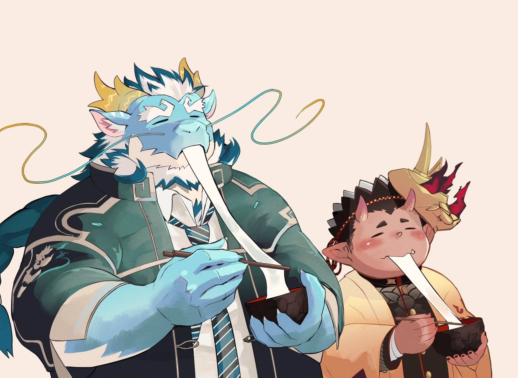 2boys amanojaku_(housamo) animal_ear_fluff aqua_hair aqua_skin bara beard black_hair blush bowl chopsticks claws closed_eyes coat colored_skin dragon_boy dragon_horns eating facial_hair food full_beard furry furry_male highres holding holding_bowl holding_chopsticks horns huge_eyebrows inutora08 japanese_clothes kimono long_mustache loose_necktie male_focus mask mask_on_head mature_male mochi mochi_trail multicolored_hair multiple_boys mustache necktie oni open_clothes open_coat pointy_ears qinglong_(housamo) red_skin shirt simple_background skin-covered_horns striped_clothes striped_necktie tokyo_houkago_summoners two-tone_beard two-tone_hair upper_body white_hair white_shirt
