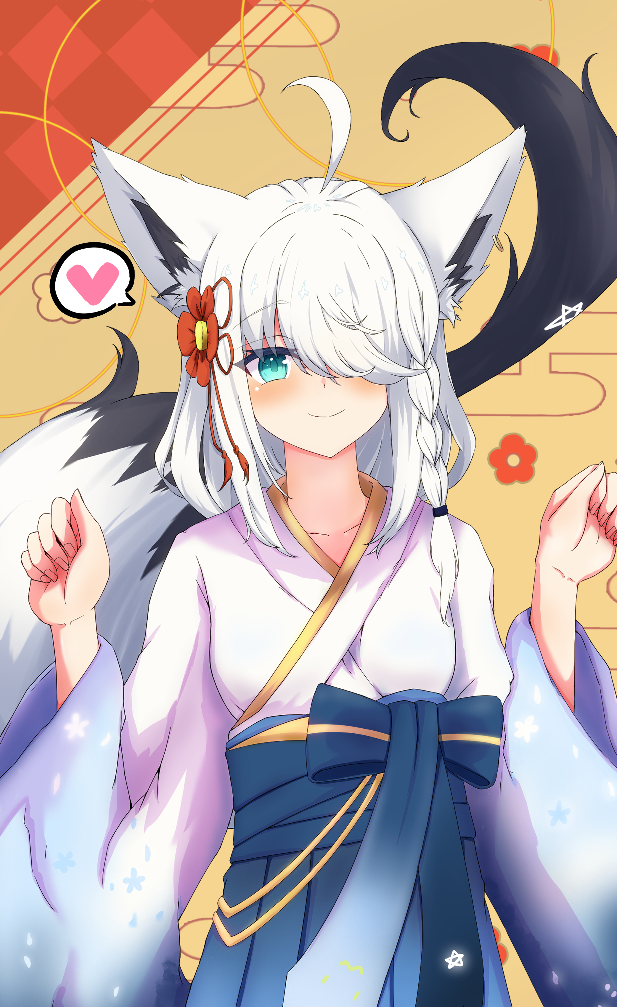 1girl absurdres ahoge animal_ear_fluff animal_ears black_kimono blush braid commentary_request earrings fox_ears fox_girl fox_tail green_eyes hair_between_eyes hair_over_one_eye heart highres hololive japanese_clothes jewelry kimono long_hair looking_at_viewer obi official_alternate_costume pentagram sash shirakami_fubuki shirakami_fubuki_(new_year) sidelocks single_braid smile solo sorazumiumi spoken_heart swept_bangs tail virtual_youtuber white_hair white_kimono