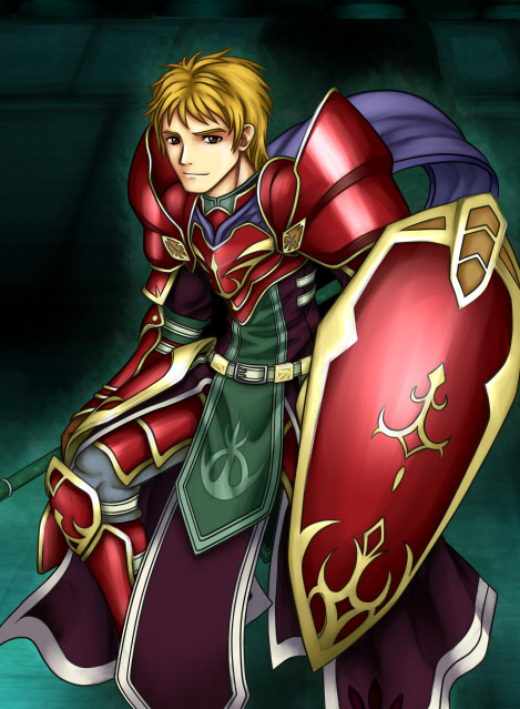 1boy armor blonde_hair breastplate brown_eyes commentary_request fire_emblem fire_emblem:_radiant_dawn holding holding_polearm holding_shield holding_weapon levail_(fire_emblem) looking_at_viewer nintendo pauldrons polearm purutoppu_(toranohige) red_armor shield shoulder_armor smile solo standing weapon