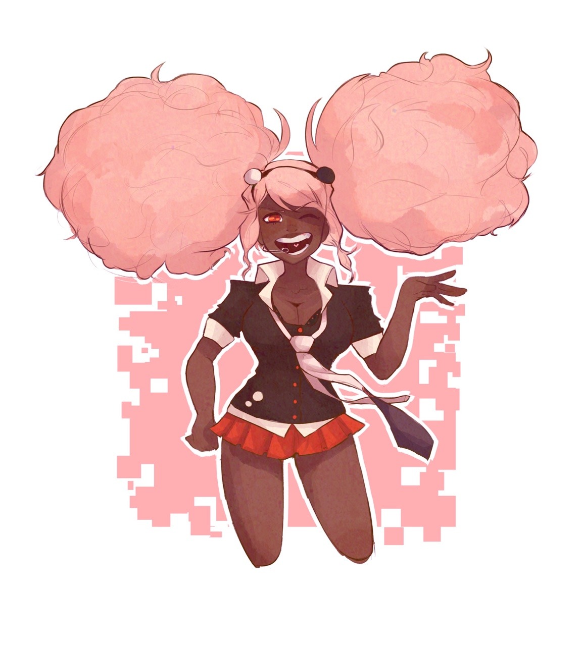 1girl afro afro_puffs bikini black_bra black_hairband black_headband black_headwear black_shirt blonde_hair bra breasts cleavage collarbone danganronpa_(series) danganronpa_another_episode:_ultra_despair_girls dark-skinned_female dark_skin docochocart eyelashes female_focus hairband hand_up headband headset heart highres large_breasts long_hair looking_at_viewer medium_breasts micro_bikini miniskirt multicolored_hair one_eye_closed open_mouth pink_background pleated_skirt red_eyes red_skirt second_generation_enoshima_junko shirt short_sleeves simple_background skirt solo swimsuit teeth twintails underwear white_background