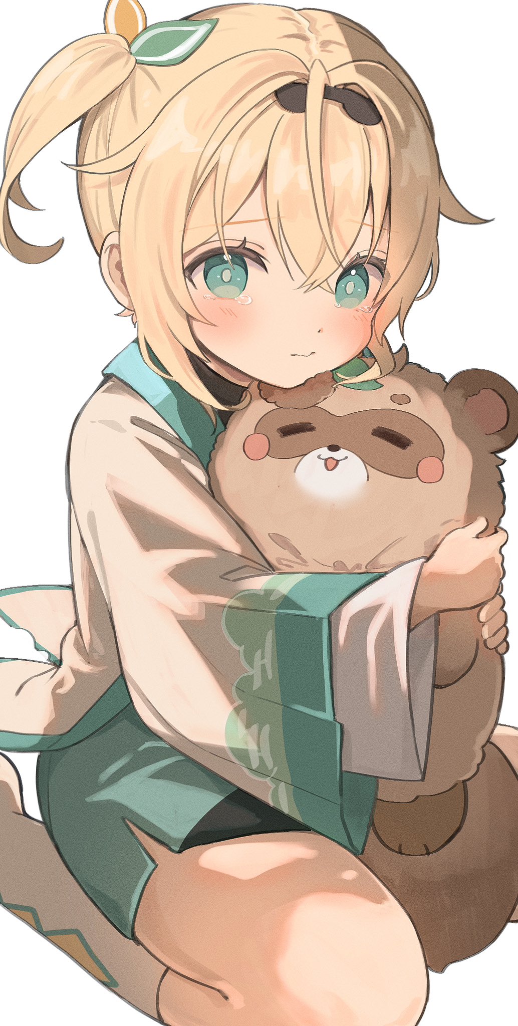 1girl aged_down black_hairband blonde_hair bright_pupils green_eyes green_skirt hair_between_eyes hairband haori highres hololive hug japanese_clothes kakeru_(kakekaker001) kazama_iroha kazama_iroha_(1st_costume) light_blush looking_at_viewer pokobee side_ponytail simple_background sitting skirt socks solo tearing_up tears virtual_youtuber wariza white_background white_socks