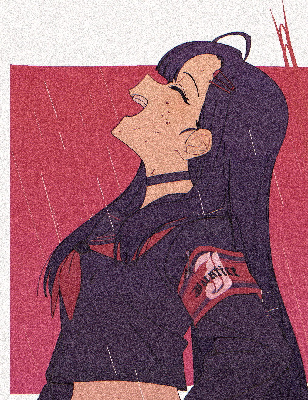 1girl ahoge armband black_choker black_hair black_sailor_collar black_serafuku blue_archive border choker closed_eyes commentary facing_up from_side hair_ornament hairclip halo highres ichika_(blue_archive) long_hair long_sleeves midriff neckerchief open_mouth outside_border parted_bangs rain red_armband red_background red_halo red_neckerchief sailor_collar school_uniform serafuku sideways_mouth smile solo tenohira_(tenoo) upper_body white_border