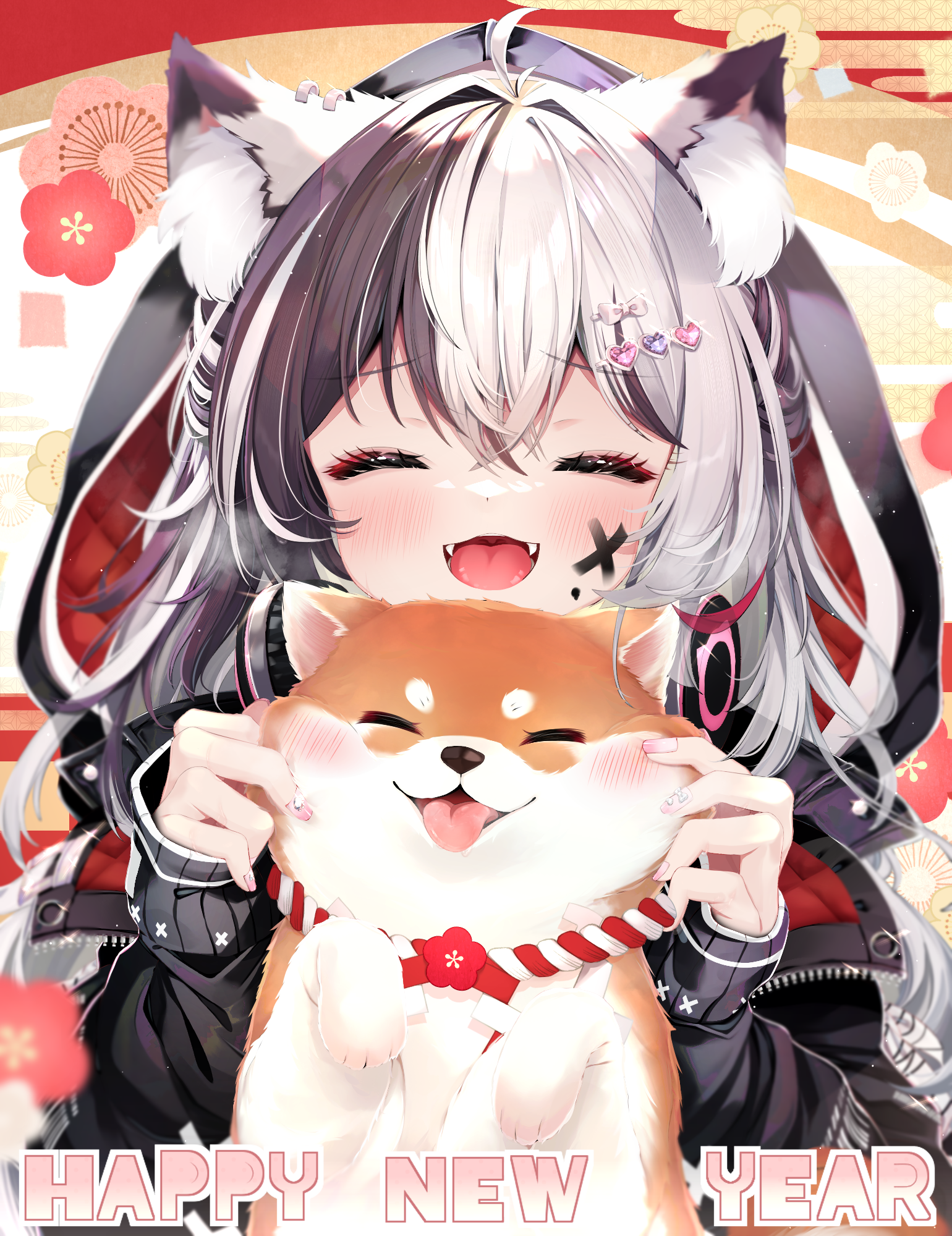 1girl :d ^_^ amane_shiira animal animal_ear_fluff animal_ears black_hair black_jacket blush cat_ears cat_girl cheek_pinching cheek_pull closed_eyes dog facing_viewer fangs happy_new_year headphones headphones_around_neck highres hood hood_up hooded_jacket indie_virtual_youtuber jacket kouhaku_nawa long_hair long_sleeves multicolored_hair new_year open_mouth paid_reward_available pinching rope shiba_inu shiira_(nya_rl) shimenawa smile tongue tongue_out two-tone_hair virtual_youtuber white_hair