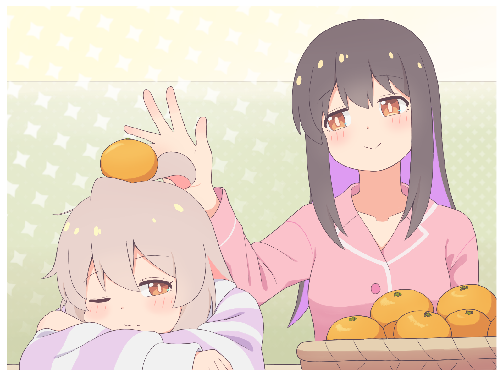2girls :> ahoge basket black_hair brown_eyes commentary food food_on_head fruit fruit_on_head genderswap genderswap_(mtf) hair_down head_rest highres k-d light_blush long_hair long_sleeves looking_at_another multicolored_hair multiple_girls object_on_head one_eye_closed onii-chan_wa_oshimai! orange_(fruit) oyama_mahiro oyama_mihari pink_hair purple_hair siblings sisters smile two-tone_hair