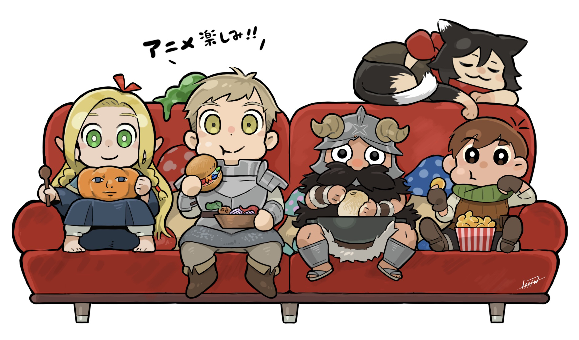 2girls 3boys :t animal_ears armor beard black_hair black_pants blonde_hair blue_capelet blue_robe body_fur boots bowl braid brown_gloves burger capelet cat_ears cat_girl cat_tail chainmail chibi chilchuck_tims closed_mouth couch crop_top dough dungeon_meshi dwarf eating elf facial_hair fake_horns flip-flops food fruit_bowl full_body gloves gorget green_eyes green_scarf grey_hair grey_pants hair_between_eyes halfling helmet highres holding holding_bowl holding_burger holding_food holding_spoon horned_helmet horns izutsumi knees_up laaaw444 laios_touden leather_armor long_hair long_sleeves lying mandrake marcille_donato midriff multiple_boys multiple_girls mushroom neck_warmer on_stomach pants parted_bangs pauldrons plate_armor pointy_ears popcorn pumpkin red_scarf robe sandals scarf senshi_(dungeon_meshi) shin_guards shirt shoe_soles short_hair shoulder_armor signature simple_background sitting sleeping sleeveless slime_(creature) smile spoon tail twin_braids vambraces walking_mushroom_(dungeon_meshi) watching_television white_background white_pants white_shirt wok yellow_eyes
