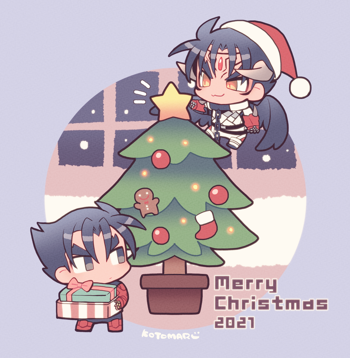 2021 2boys black_hair black_wings chain chibi christmas_ornaments christmas_tree devil_jin facial_mark forehead_jewel gift gloves grey_horns hat highres holding holding_gift horns kazama_jin kotomaru_(kotokoto_kottan) male_focus merry_christmas multiple_boys red_gloves santa_hat studded_gloves tekken thick_eyebrows v-shaped_eyebrows window wings yellow_eyes