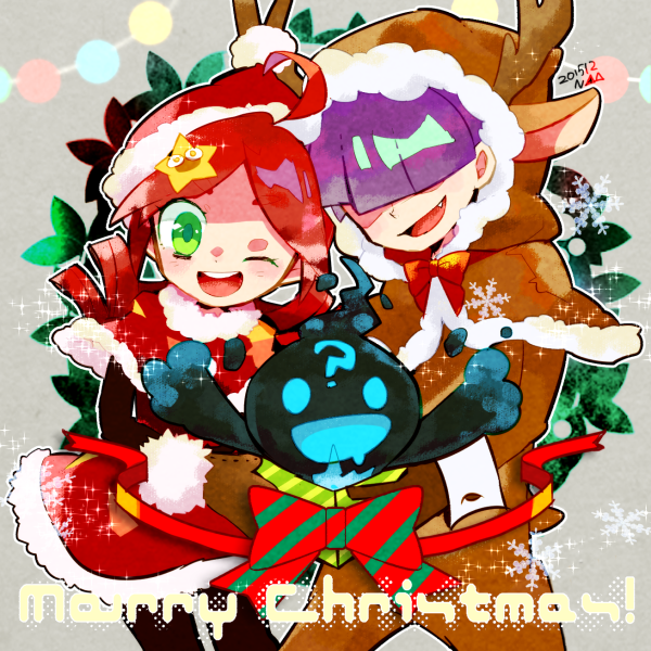 1girl 2boys 73_(naa) ? andou_ringo animal_costume bow dated drill_hair drooling ecolo_(puyopuyo) eyelashes fang fur-trimmed_jacket fur_trim green_eyes hair_over_eyes hat jacket merry_christmas mouth_drool multiple_boys one_eye_closed purple_hair puyopuyo puyopuyo_7 red_bow reindeer_costume santa_costume santa_hat sasaki_maguro short_hair smile striped_bow twin_drills