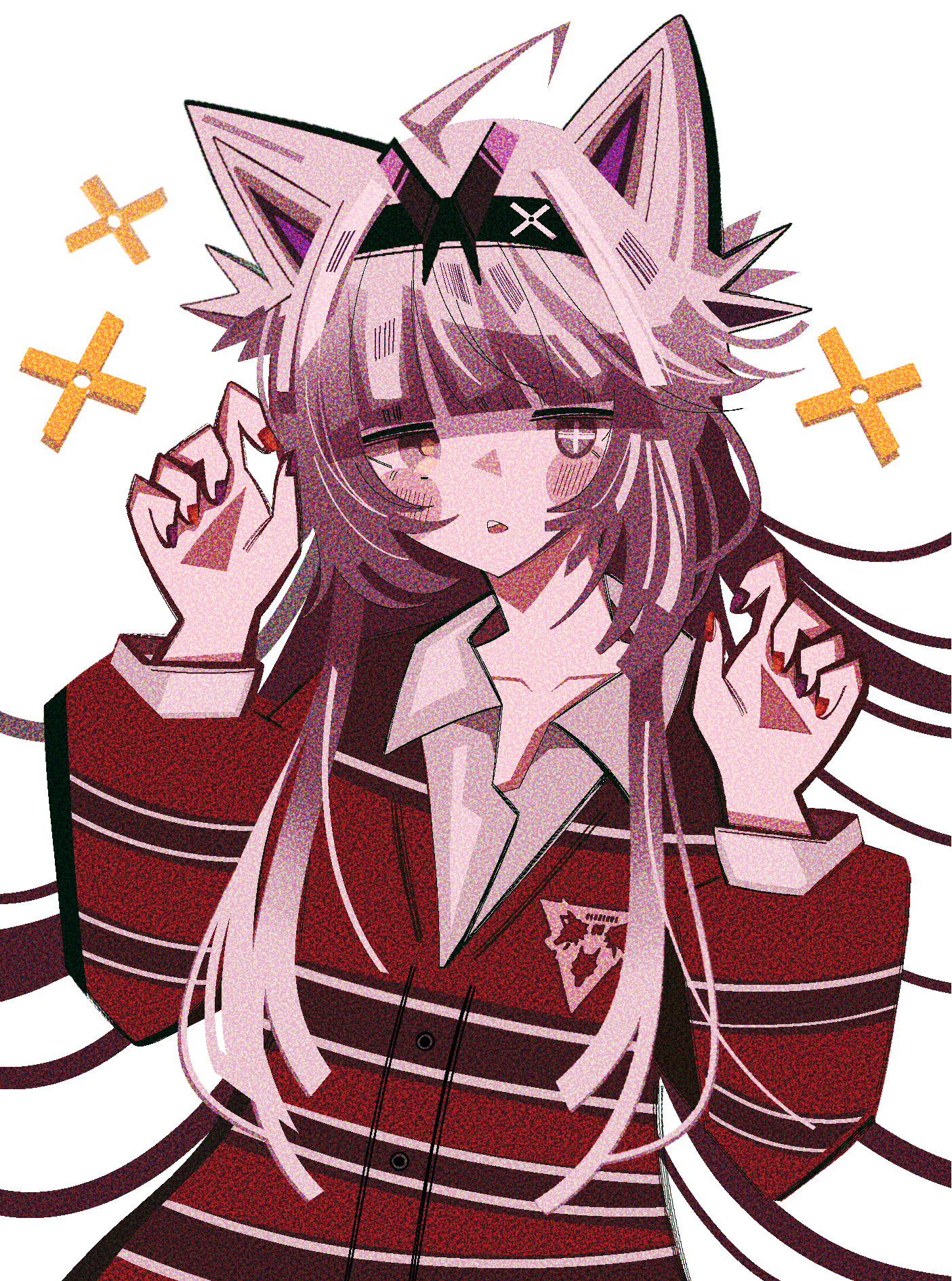1girl 961_kku alternate_costume animal_ears black_hairband bob_cut cross-shaped_pupils fake_animal_ears grey_eyes grey_hair grey_shirt hair_intakes hairband highres long_hair mechanical_ears mismatched_pupils no._21:_feral_(pgr) no._21_(pgr) punishing:_gray_raven red_sweater shirt sidelocks solo sweater symbol-shaped_pupils wolf_ears yellow_pupils