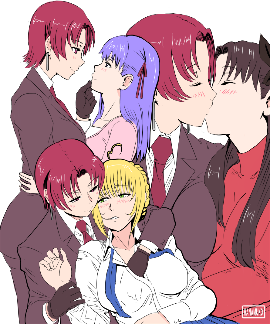 4girls ahoge artist_name artoria_pendragon_(fate) bazett_fraga_mcremitz black_hair blonde_hair closed_eyes earrings eye_contact fate/hollow_ataraxia fate/stay_night fate_(series) formal_clothes gloves grabbing_another's_breast green_eyes groping hanamuko hand_on_another's_chin jewelry kiss light_blush long_hair looking_at_another matou_sakura medium_hair multiple_girls multiple_views necktie purple_eyes purple_hair red_eyes red_hair saber_(fate) short_hair simple_background smile suit tohsaka_rin white_background yuri