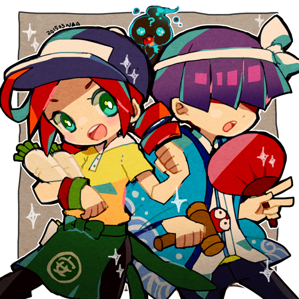 1girl 2boys 73_(naa) andou_ringo apple apron black_pants blue_headwear clenched_hand daikon drill_hair ecolo_(puyopuyo) food fruit green_apron green_eyes hair_over_eyes hand_fan haori holding holding_fan japanese_clothes kendama multiple_boys open_mouth pants purple_eyes puyopuyo puyopuyo_7 radish sasaki_maguro shirt short_hair twin_drills waist_apron yellow_shirt