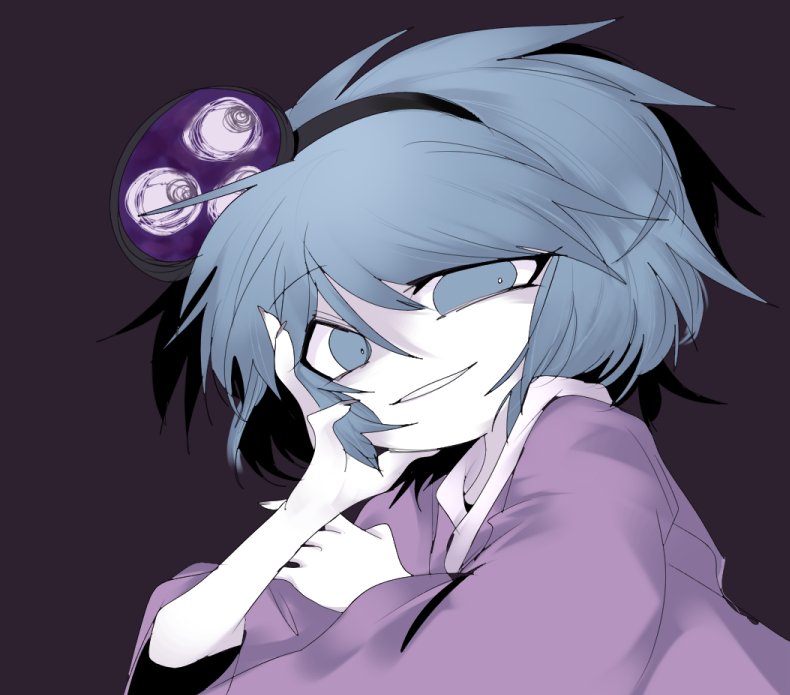 1other androgynous black_hairband blue_eyes blue_hair colored_skin commentary_request hair_between_eyes hairband hand_on_own_head japanese_clothes kimono len'en ling_s long_sleeves no_nose other_focus purple_background purple_kimono short_hair simple_background smile solo terumi_(len'en) white_skin