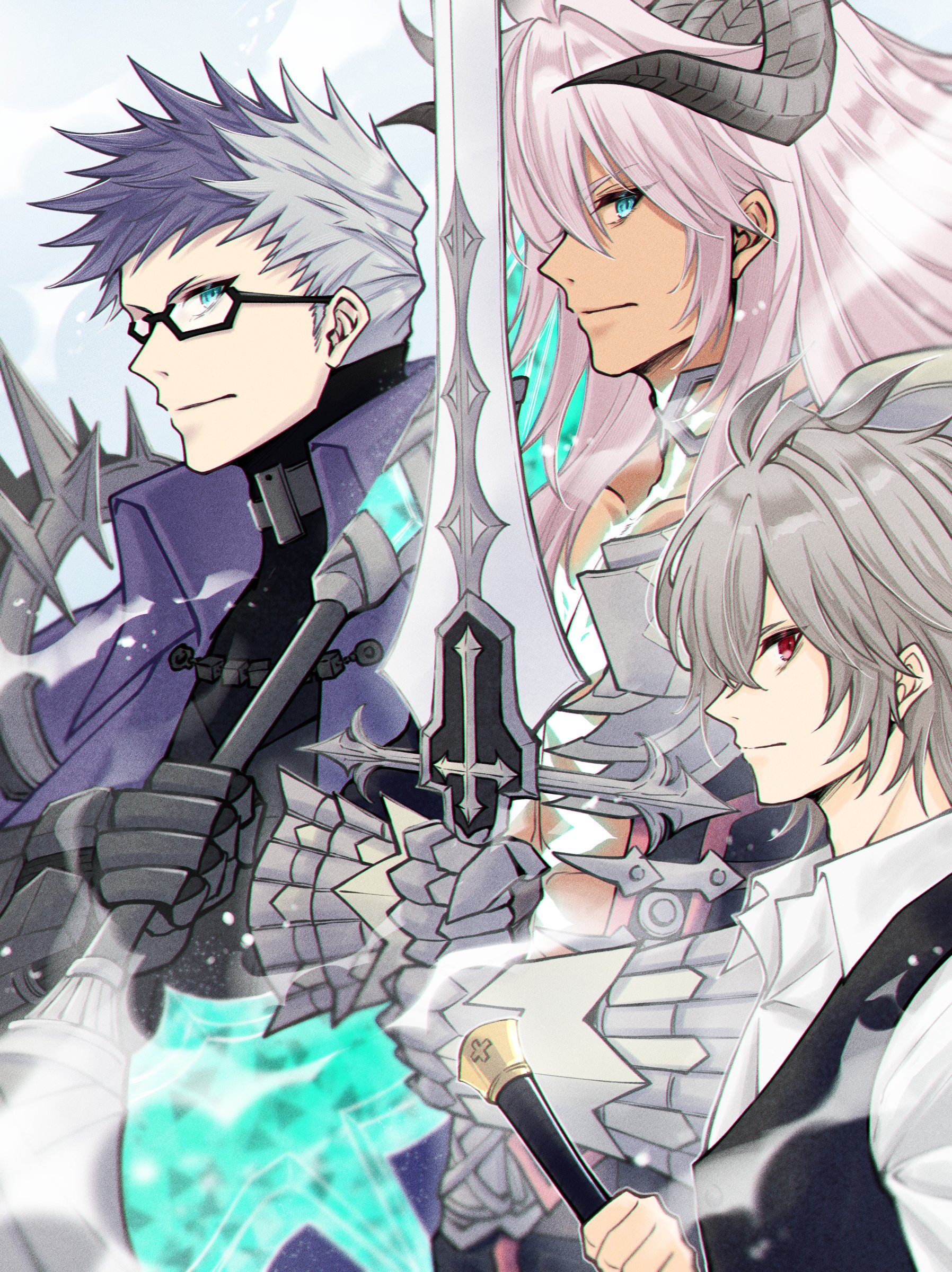 3boys absurdres blue_eyes fate/grand_order fate_(series) gauntlets genmai_(crowcrowclown) glasses grey_hair highres holding holding_sword holding_weapon horns male_focus multicolored_hair multiple_boys red_eyes sieg_(fate) siegfried_(fate) sigurd_(fate) sword sword_in_front_of_face two-tone_hair weapon