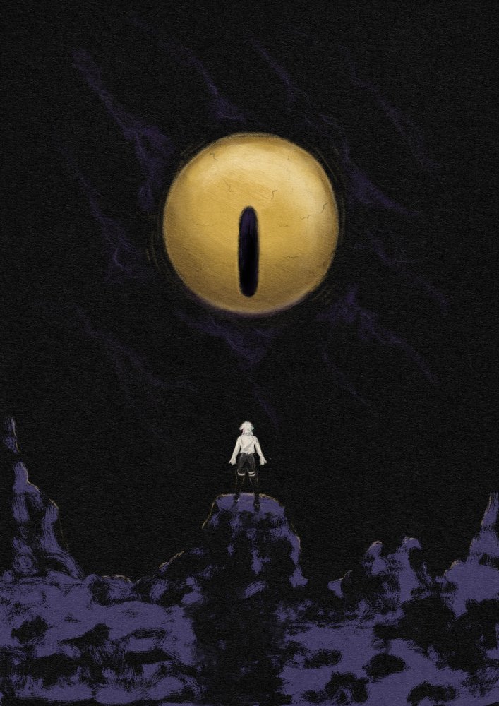 1boy black_shorts boots colored_sclera commentary creature english_commentary facing_another from_behind full_body gavis_bettel gildedlions holostars holostars_english horror_(theme) long_sleeves looking_at_another looking_down looking_up male_focus night phantom_(gavis_bettel) scenery shirt short_hair shorts slit_pupils solo thigh_boots virtual_youtuber white_hair white_shirt yellow_sclera