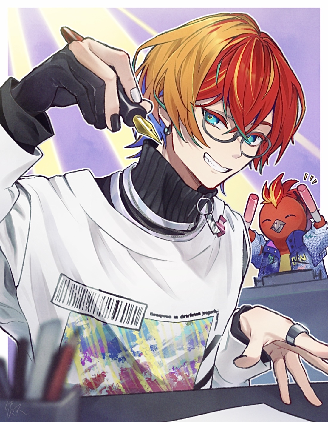 1boy aqua_eyes black_gloves chain chain_necklace earrings foreshortening from_below g-penguin_(hizaki_gamma) glasses gloves grin hair_between_eyes half_gloves highres hizaki_gamma holding holding_pen holostars jewelry looking_at_viewer male_focus multicolored_hair necklace outside_border pen ring short_hair smile suama_(haruichi) teeth two-tone_hair upper_body virtual_youtuber