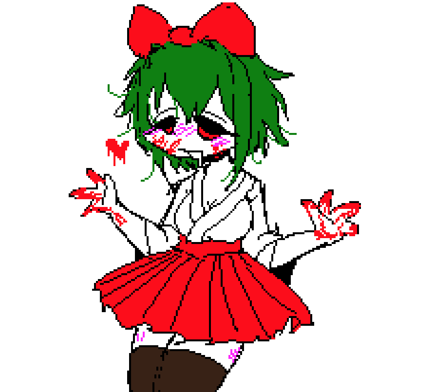 blood blood_on_face blood_on_hands blush bow drooling green_eyes green_hair gumi japanese_clothes kimono mai_shishikusa masa_works_design onibi onibi_series pixel_art red_bow thighhighs vocaloid