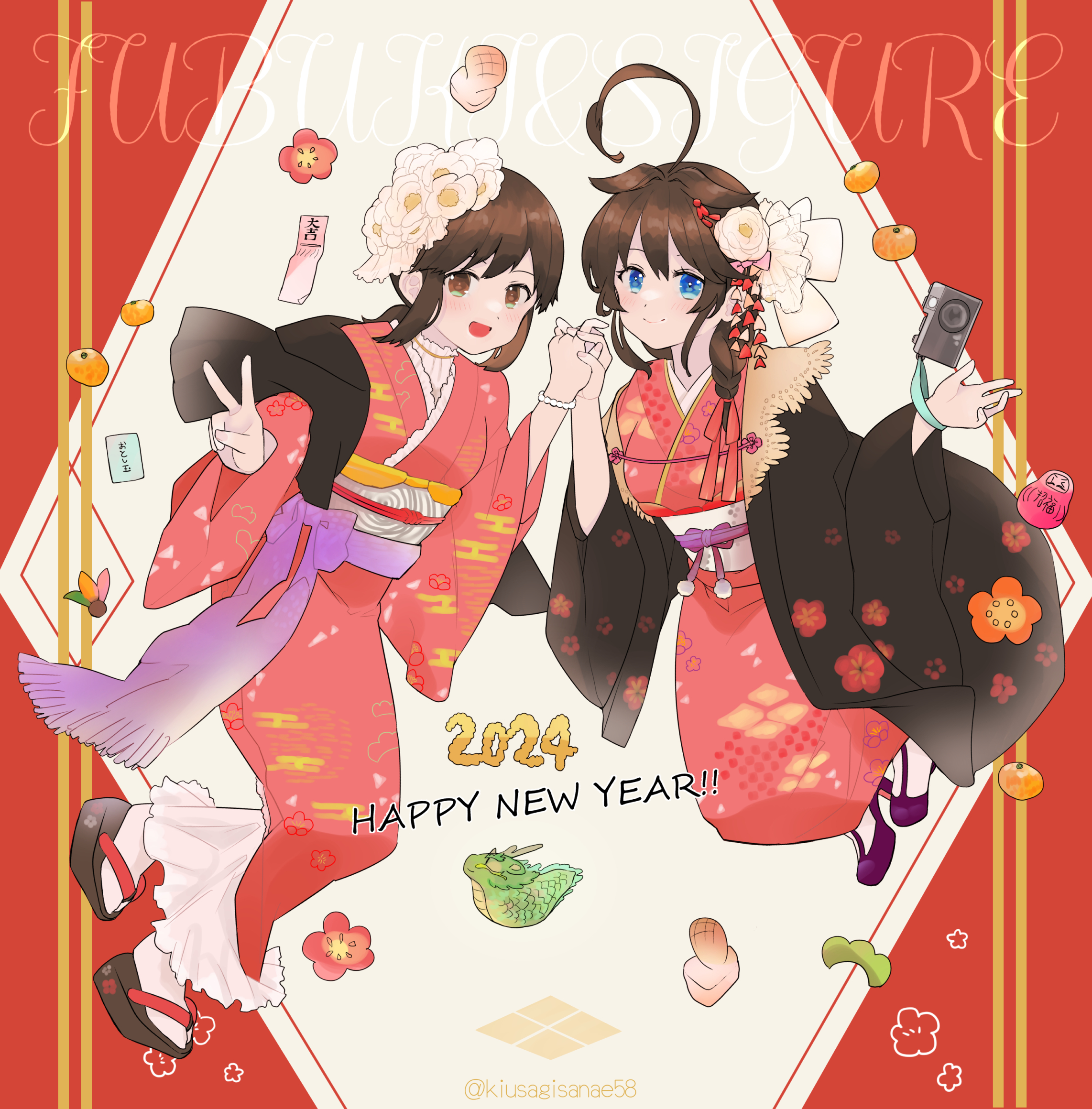 2024 2girls :d ahoge alternate_costume blue_eyes braid brown_eyes brown_hair camera commentary_request english_text floral_print flower food fruit fubuki_(kancolle) full_body hair_flaps hair_flower hair_ornament hair_over_shoulder happy_new_year high_heels highres holding_hands huge_ahoge japanese_clothes kantai_collection kimono kiusagi_sanae long_hair long_sleeves looking_at_viewer low_ponytail medium_hair multiple_girls new_year obi okobo open_mouth orange_(fruit) platform_sandals ponytail print_kimono red_kimono sandals sash shigure_(kancolle) sidelocks single_braid smile socks twitter_username white_socks wide_sleeves