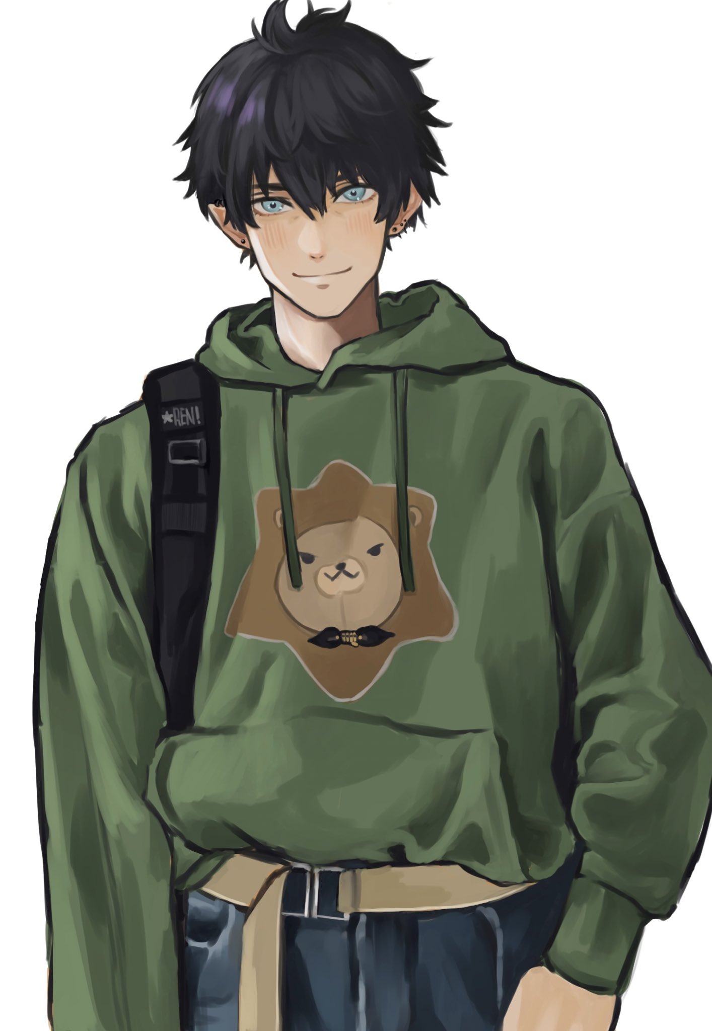 1boy alternate_costume annoel augustus_(luca_kaneshiro) belt black_hair blue_eyes denim green_hoodie highres hood hoodie jeans looking_at_viewer male_focus nijisanji nijisanji_en pants pointy_ears ren_zotto simple_background solo virtual_youtuber white_background yellow_belt