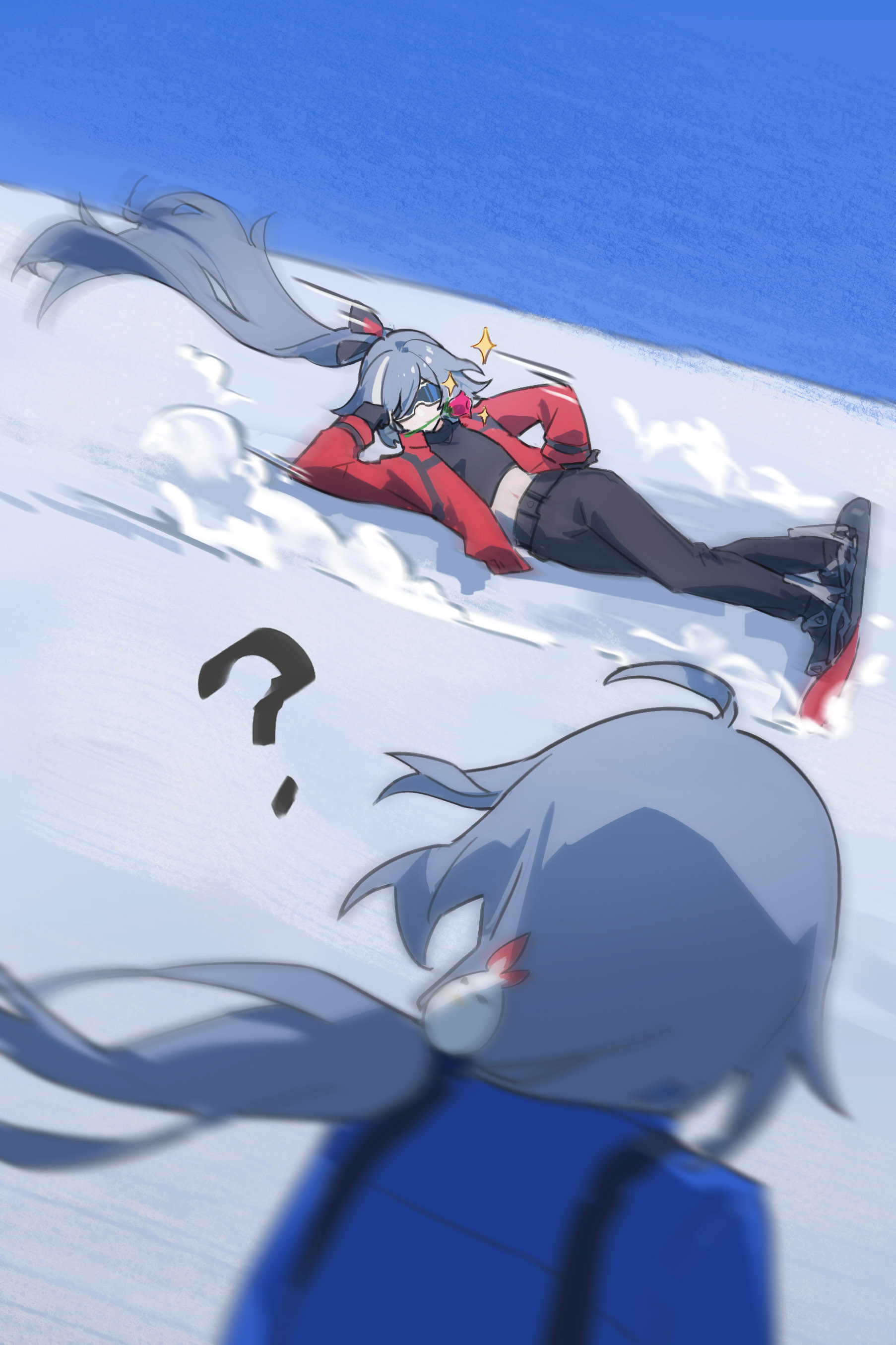 2girls ? absurdres ahoge black_footwear black_gloves black_pants black_shirt blue_background blue_hair blue_sky day dual_persona flower flower_in_mouth fu_hua herrscher_of_sentience gloves goggles grey_hair hair_between_eyes highres honkai_(series) honkai_impact_3rd jacket jingwei_(bird) long_hair looking_at_another multicolored_hair multiple_girls outdoors pants ponytail red_flower red_jacket red_rose rose shirt skiing sky sliding snow star_(symbol) streaked_hair white_hair xiaoxiaoanye