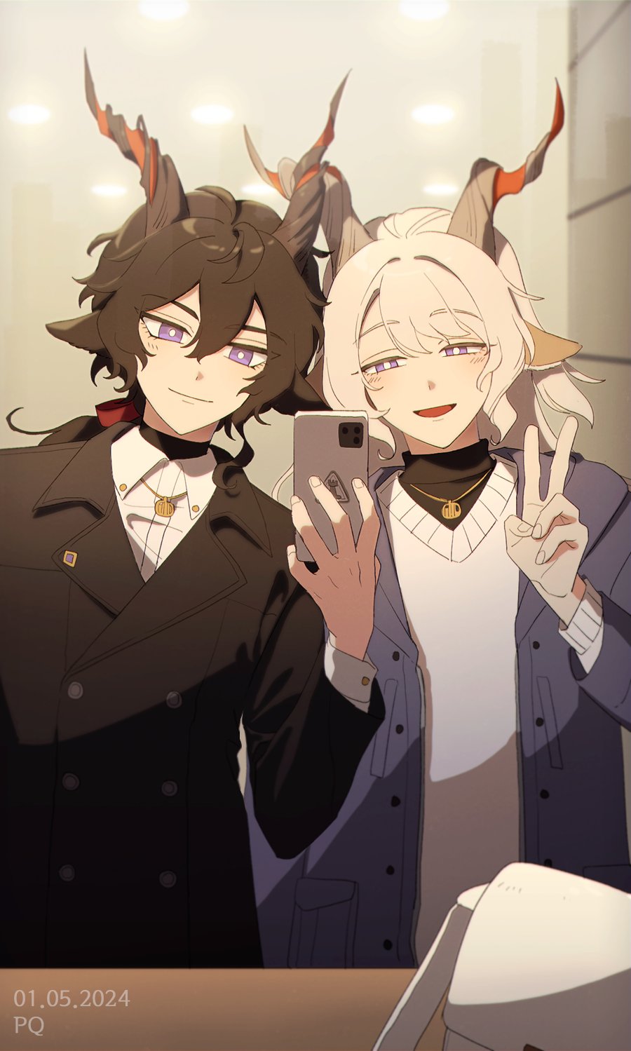 2boys animal_ears arknights artist_name black_coat black_hair blush bow cellphone coat commentary_request dated ebenholz_(arknights) goat_boy goat_ears goat_horns grey_coat hair_between_eyes hair_bow half-closed_eyes highres holding holding_phone horns korean_commentary kreide_(arknights) long_hair long_sleeves looking_at_phone male_focus multiple_boys open_mouth phone ponytail pq purple_eyes red_bow rhodes_island_logo_(arknights) selfie shirt smartphone smile sweater v white_hair white_shirt white_sweater