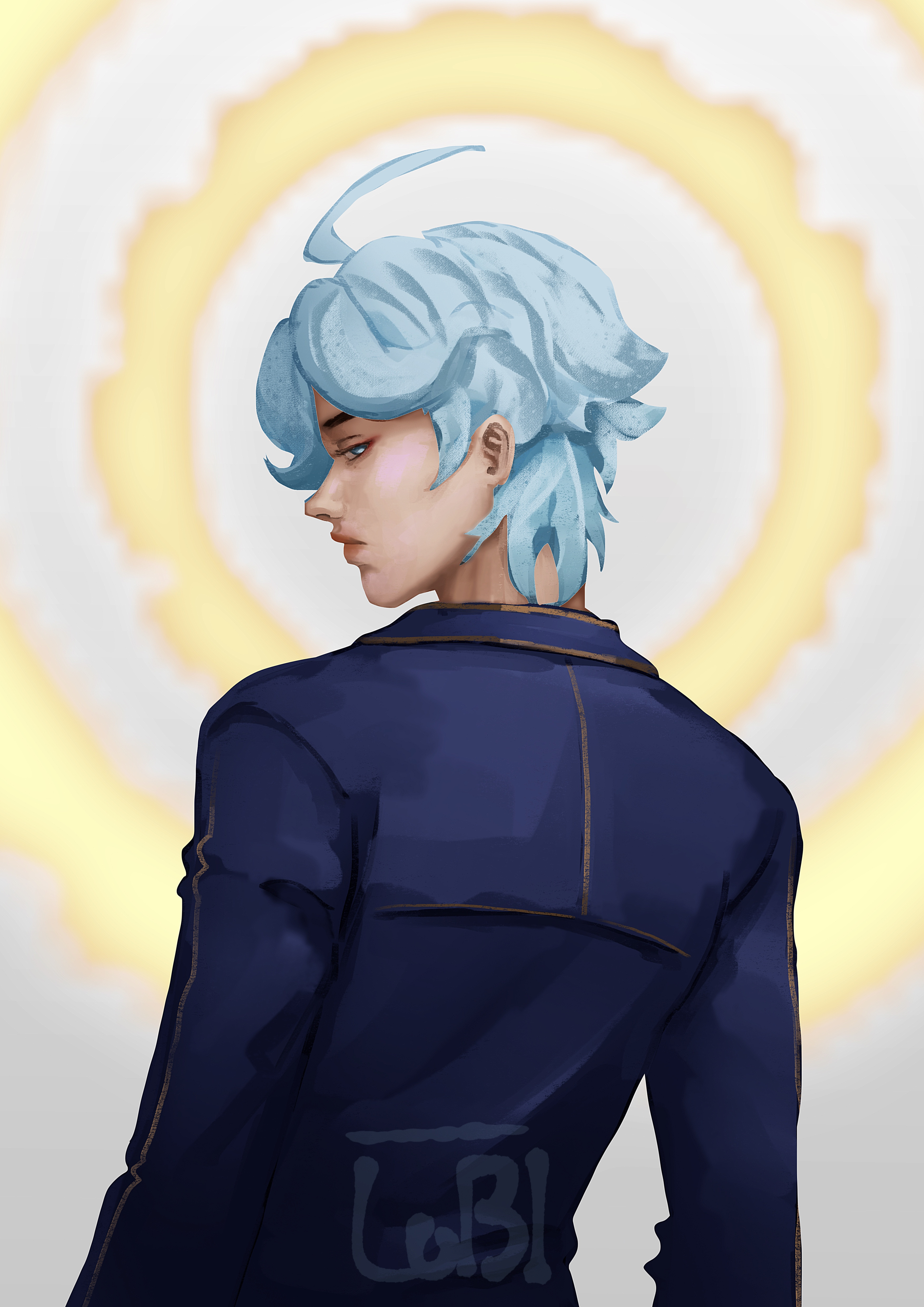 1boy absurdres ahoge artist_name blue_eyes blue_hair blue_jacket commentary english_commentary highres jacket javier_asrahan long_sleeves looking_back male_focus shanachups short_hair solo the_greatest_estate_developer
