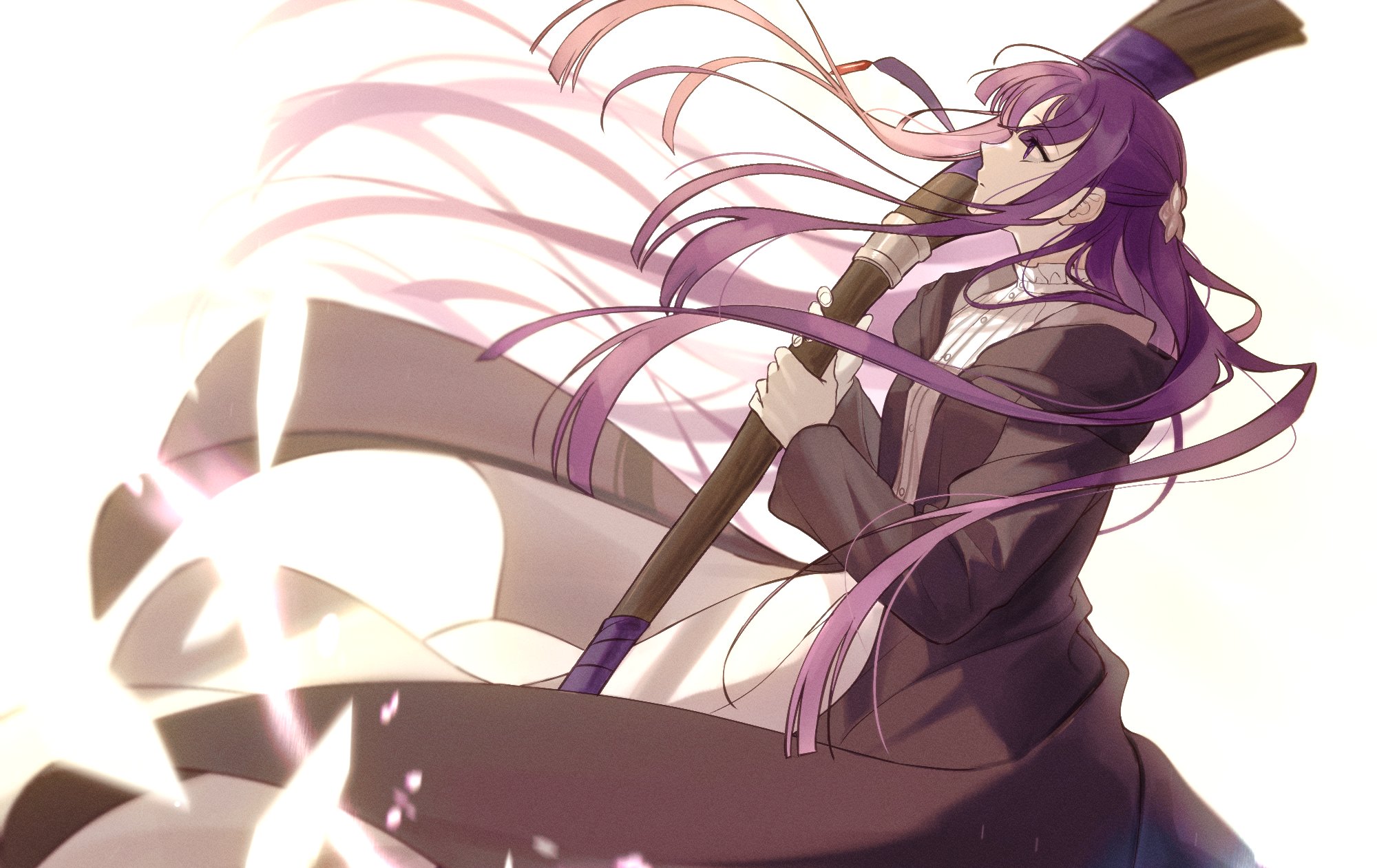 1girl black_coat coat cowboy_shot dress fern_(sousou_no_frieren) floating_hair from_side hair_ornament half_updo hands_up highres holding holding_staff korean_commentary long_hair long_sleeves looking_up mungg_kki profile purple_hair simple_background solo sousou_no_frieren staff straight_hair white_background white_dress wind