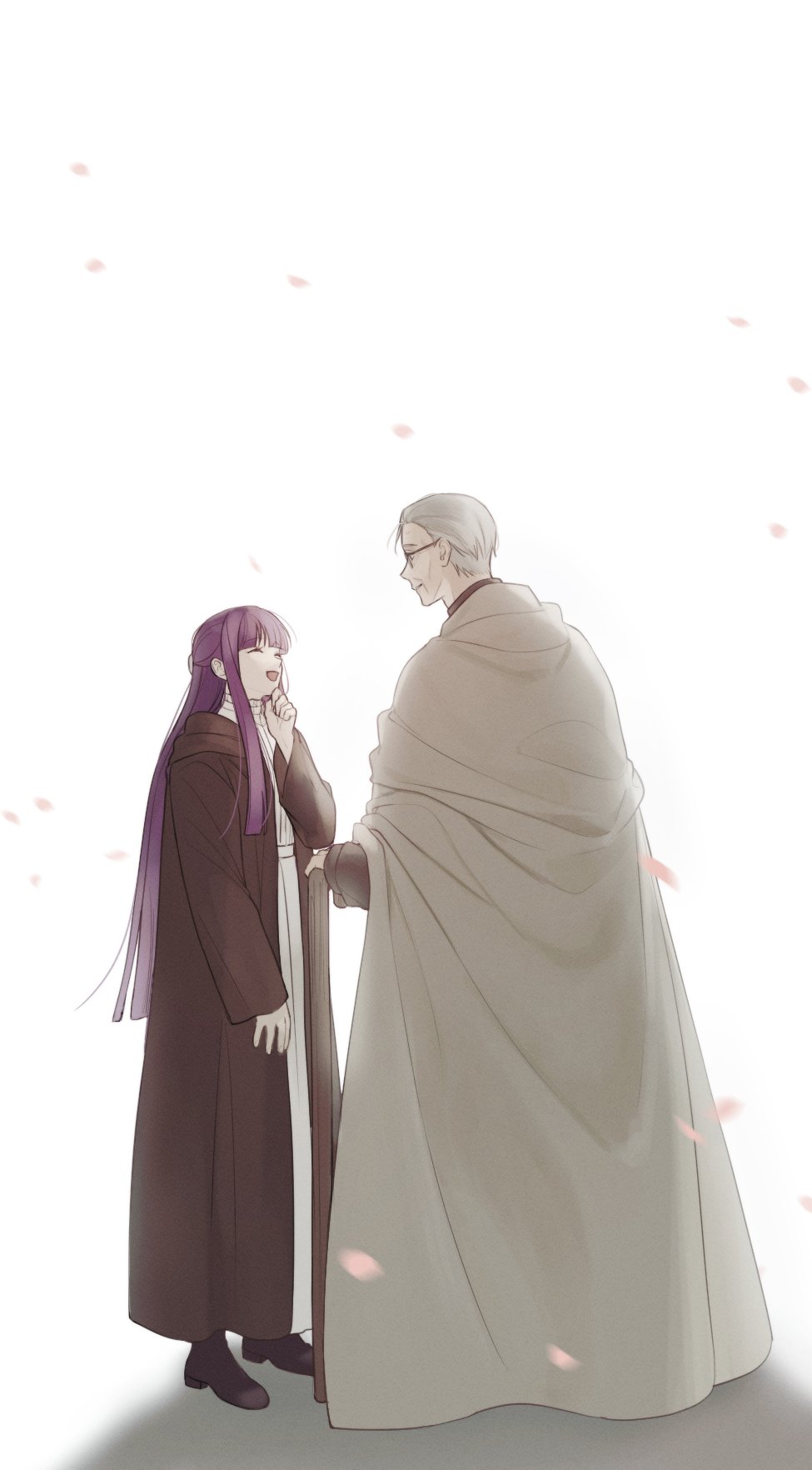 1boy 1girl ^_^ affectionate black_coat black_footwear blunt_ends cane closed_eyes coat dress eisen_(sousou_no_frieren) facing_another fern_(sousou_no_frieren) full_body glasses grey_cloak grey_hair half_updo hand_up happy heiter highres long_hair long_sleeves mungg_kki old old_man petals purple_hair simple_background sousou_no_frieren straight_hair white_background white_dress