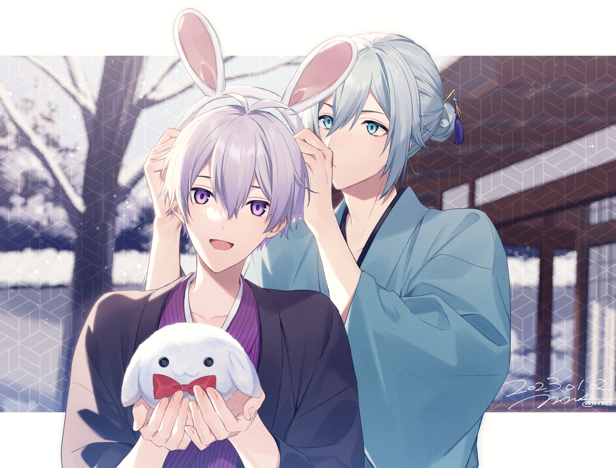 2boys aiue_o_eiua animal animal_ears architecture bare_tree blue_eyes blue_hair blue_kimono building commentary_request dated east_asian_architecture fake_animal_ears hair_ornament hair_up hairpin head_tilt highres holding holding_animal idolish7 japanese_clothes kimono kinako_(idolish7) letterboxed light_blue_hair looking_at_viewer male_focus multiple_boys open_mouth osaka_sogo outdoors patterned purple_eyes purple_hair purple_kimono short_hair signature smile tree upper_body yotsuba_tamaki yukata