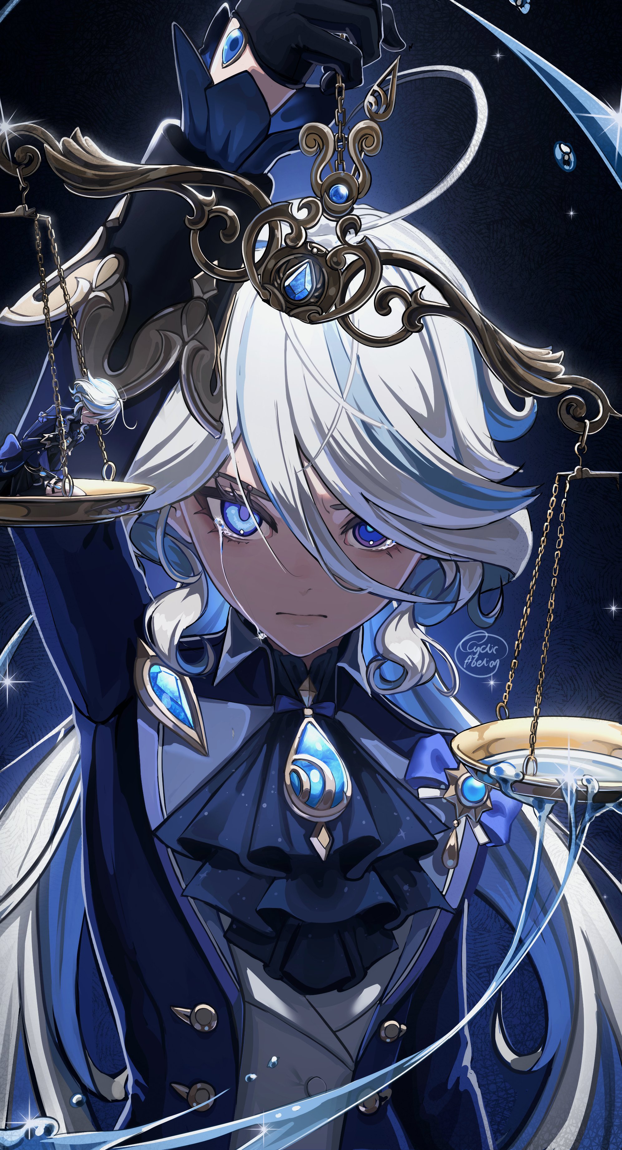 1girl absurdres arm_up artist_name ascot balance_scale black_background black_gloves blue_ascot blue_gem blue_jacket brooch cowlick crying crying_with_eyes_open cyclic_abelian drop-shaped_pupils furina_(genshin_impact) gem genshin_impact gloves hair_over_one_eye hand_up heterochromia highres holding_scale jacket jewelry lolita_fashion long_hair looking_at_viewer mini_person minigirl mismatched_pupils ouji_fashion solo straight-on symbol-shaped_pupils tears teeth upper_teeth_only wavy_hair weighing_scale white_hair