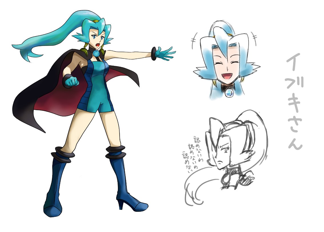 1girl blue_bodysuit blue_eyes blue_gloves blue_hair bodysuit boots cape choker clair_(pokemon) clenched_hand erushiza gloves high_heel_boots high_heels multiple_views nintendo open_mouth pokemon pokemon_heartgold_and_soulsilver ponytail smile v-shaped_eyebrows