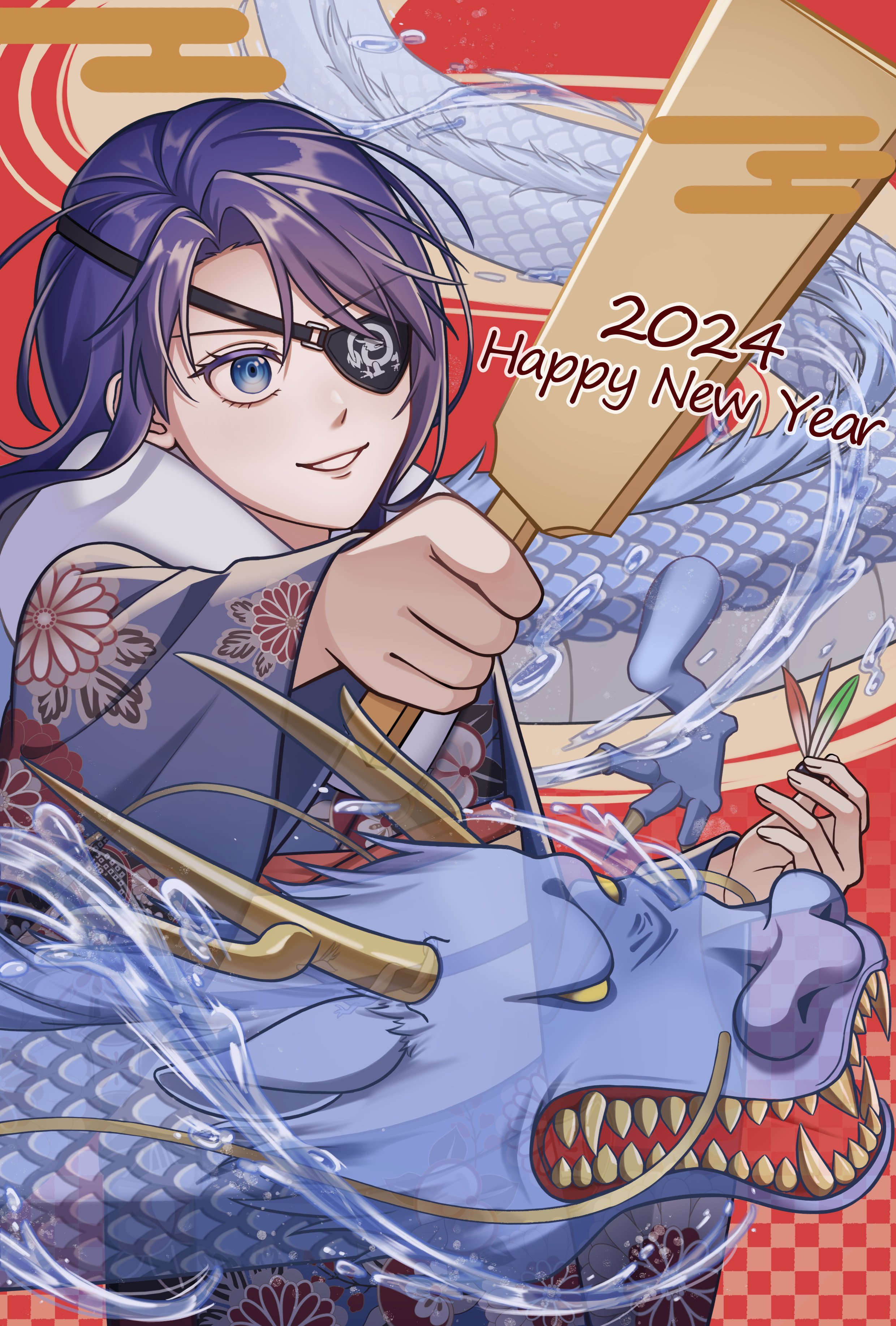 1girl 2024 absurdres alternate_costume aoi_ryugoku blue_eyes blue_hair chinese_zodiac dragon eyepatch feathers happy_new_year highres holding holding_paddle japanese_clothes kimono new_year paddle unknown_ann0 water yandere_simulator year_of_the_dragon yukata