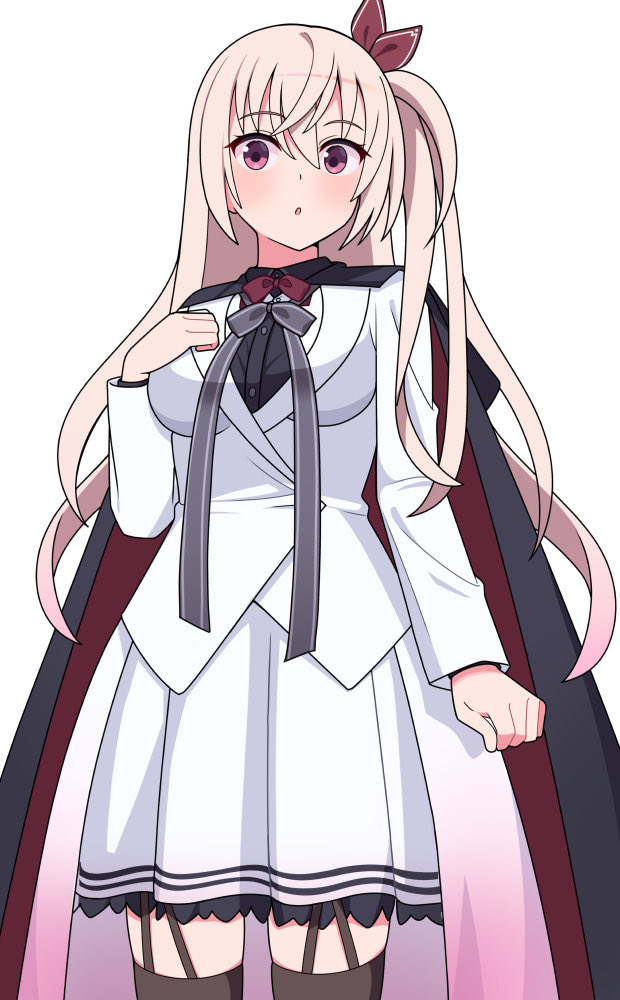 1girl :o akizuki_kanna arm_at_side black_cloak black_ribbon blush bow bowtie breasts cafe_stella_to_shinigami_no_chou clenched_hand cloak commentary cowboy_shot crossed_bangs eyes_visible_through_hair frilled_skirt frills garter_straps hair_between_eyes hair_ribbon hand_up large_breasts light_brown_hair long_hair looking_at_viewer open_mouth purple_eyes red_bow red_bowtie red_ribbon ribbon side_ponytail simple_background skirt solo standing white_background white_skirt zlmh7okwwbmghfo