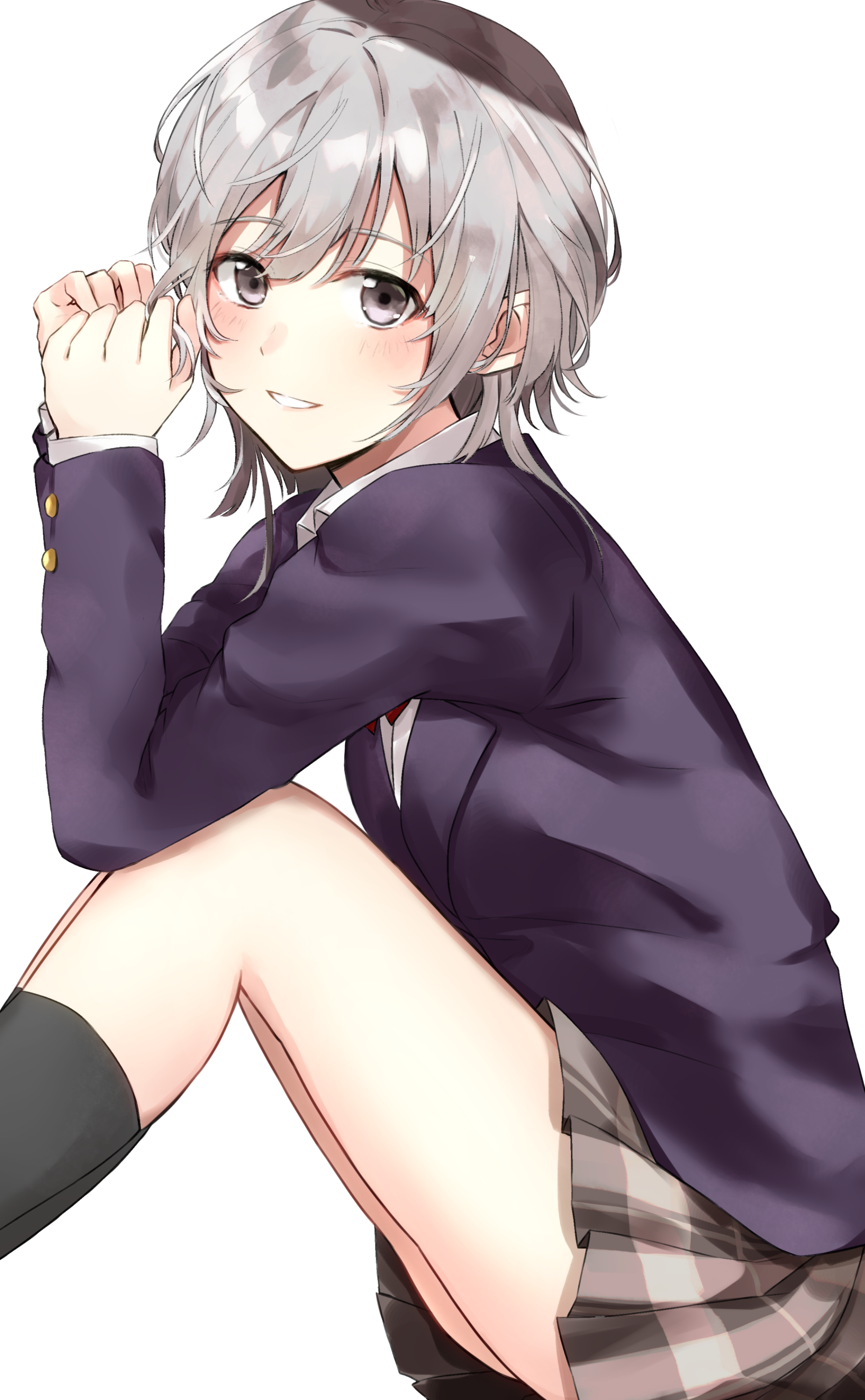 absurdres black_jacket black_socks blazer brown_skirt collared_shirt commentary_request elbows_on_knees from_side grey_eyes grey_hair highres jacket jaku-chara_tomozaki-kun ka1se1 kikuchi_fuuka kneehighs knees_up long_sleeves looking_at_viewer looking_to_the_side miniskirt parted_lips plaid_clothes plaid_skirt pleated_skirt school_uniform shirt short_hair sitting skirt smile socks white_background white_shirt