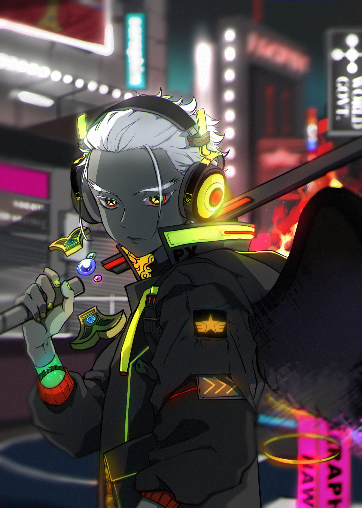 1boy black_wings dark_skin hair_slicked_back headphones highres hood looking_at_viewer male_focus one_piece s-hawk seraphim_(one_piece) solo star_(symbol) tomatobanana82 white_hair wings yoru_(sword)