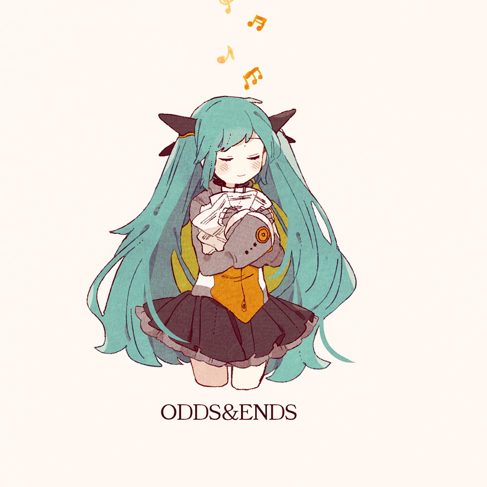 1girl blue_hair blush closed_eyes commentary_request cropped_legs fingerless_gloves gloves hair_ornament hatsune_miku hatsune_miku_(heartbeat) holding holding_paper long_hair long_sleeves musical_note odds_&_ends_(vocaloid) paper ponponzutea project_diva_(series) sheet_music skirt sleeves_past_wrists smile solo song_name twintails very_long_hair vocaloid