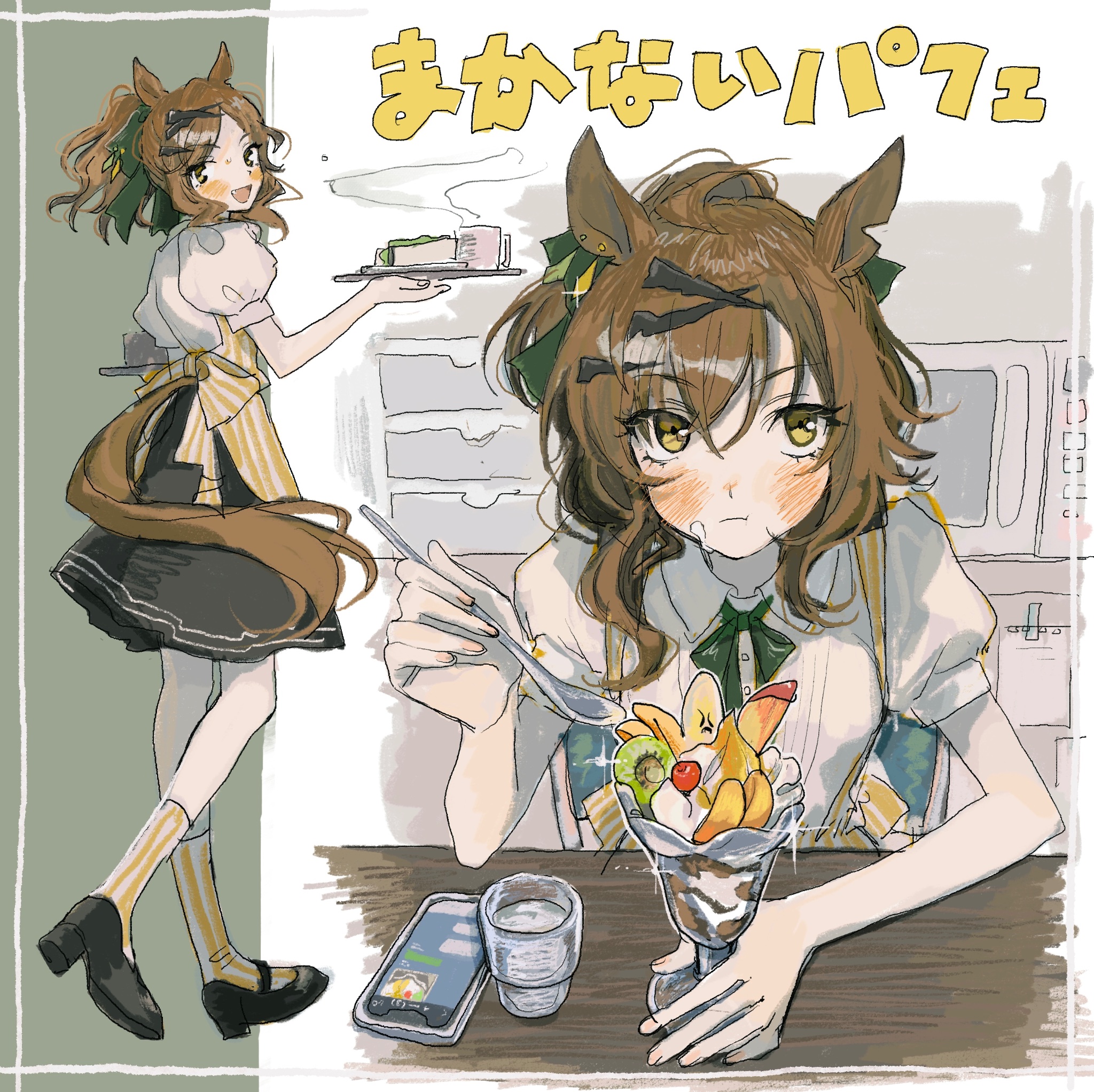 1girl :t alternate_costume animal_ears apron black_shoes black_skirt blush bow bowtie breasts brown_hair cellphone chair closed_mouth collared_shirt cup food food_on_face highres holding holding_spoon holding_tray horse_ears ice_cream indoors jungle_pocket_(umamusume) kneehighs looking_at_viewer microphone multiple_views notched_ear phone ponytail puffy_short_sleeves puffy_sleeves shirt shoes short_hair short_sleeves sitting skirt small_breasts smartphone socks sparkle spoon steam subaru_(user_tmwv7722) sundae table translation_request tray umamusume white_shirt yellow_eyes