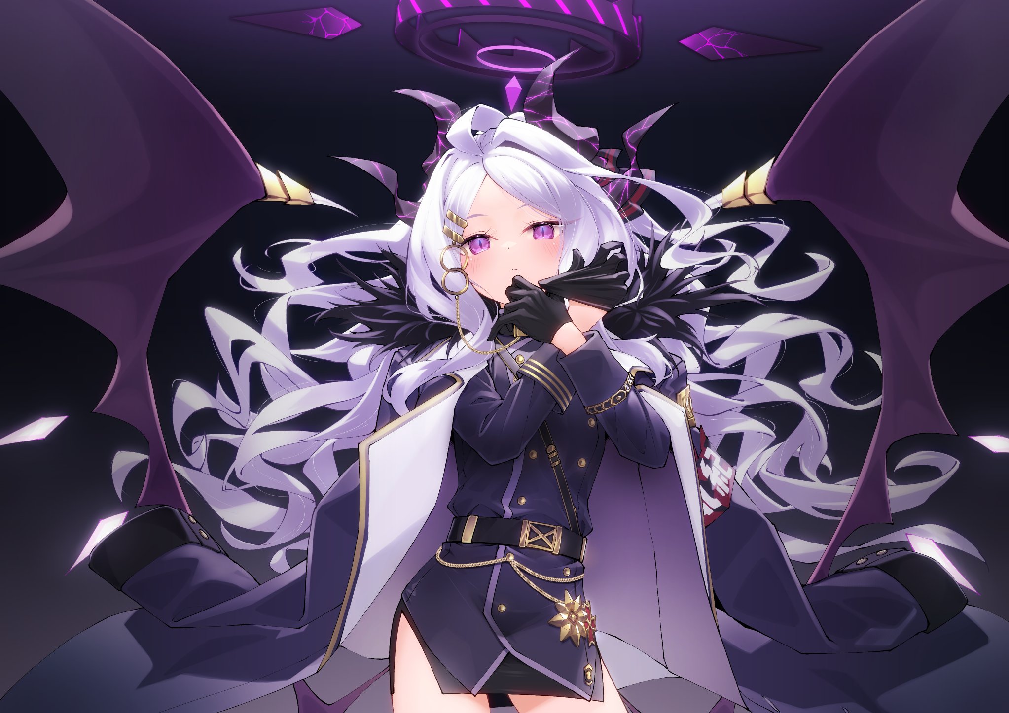 1girl ahoge aiguillette belt black_belt black_coat black_gloves black_horns black_skirt blue_archive blush closed_mouth coat coat_on_shoulders cowboy_shot demon_horns demon_wings fur-trimmed_coat fur_trim gloves halo highres hina_(blue_archive) horns multiple_horns n4gare_b0shi parted_bangs pencil_skirt purple_eyes purple_wings side_slit skirt solo white_hair wings