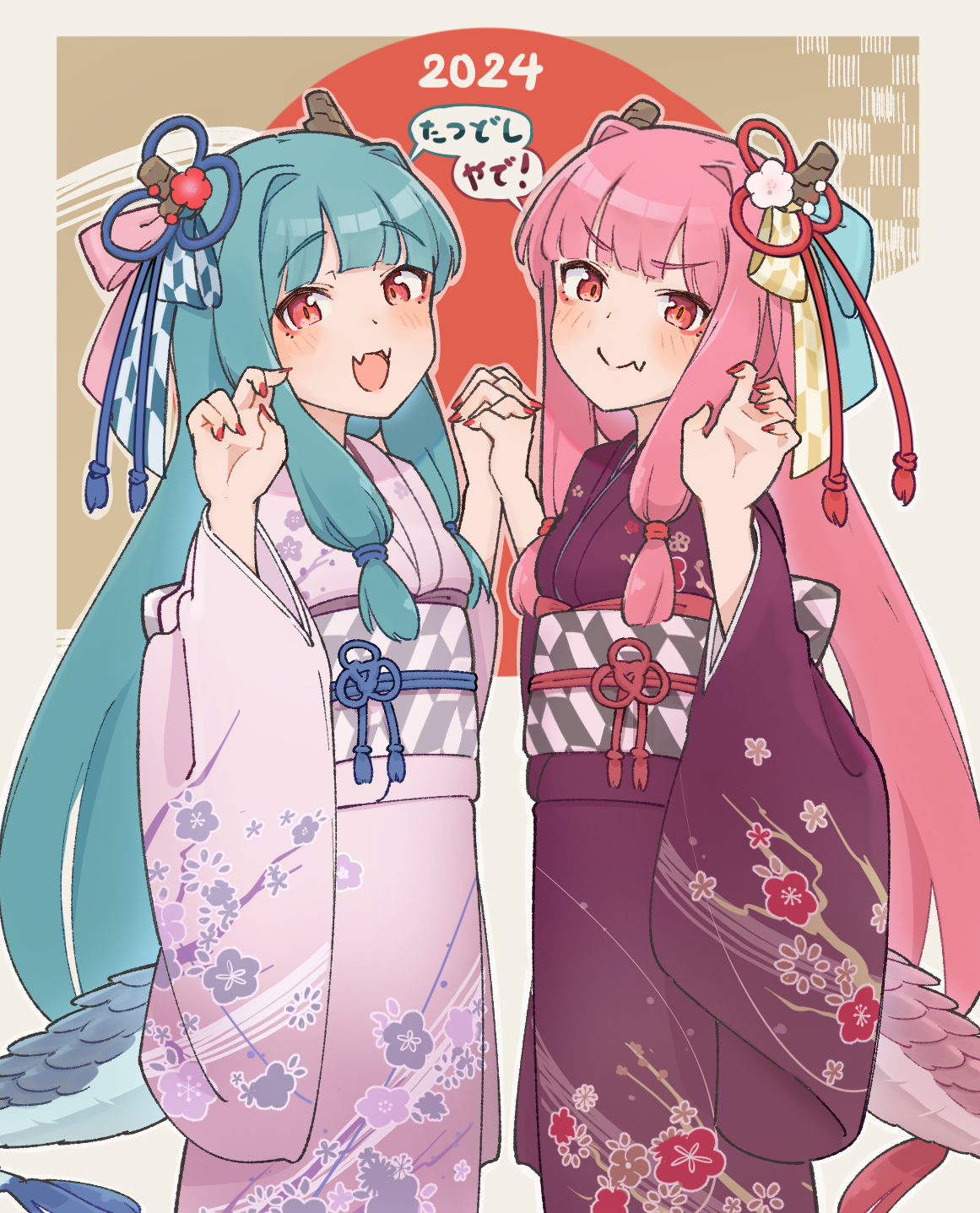 2024 2girls black_kimono blue_hair blush closed_mouth dragon_horns fang fangs fingernails floral_print highres horns japanese_clothes kimono kotonoha_akane kotonoha_aoi long_hair long_sleeves multiple_girls nail_polish obi open_mouth pink_hair print_kimono red_eyes red_nails sash siblings sisters skin_fang skin_fangs smile sumitsubame twins voiceroid white_kimono wide_sleeves